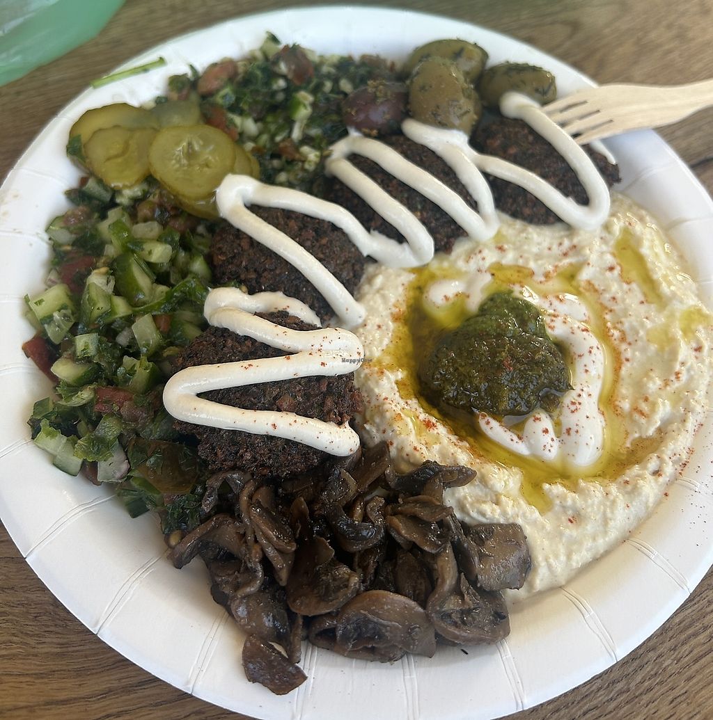 We had rafalafel plates and they tasted real good. For the price I expected more falafels though. Overall, pretty chill vibe and music, hip cashier. There was yoga nearby on the grass for anyone who was interested.