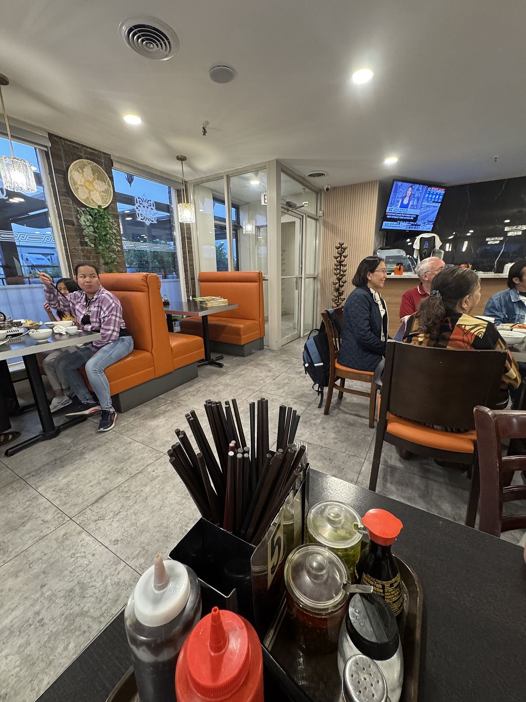 Pros: Delicious food, Silverware, chopsticks, and condiments on table, Market