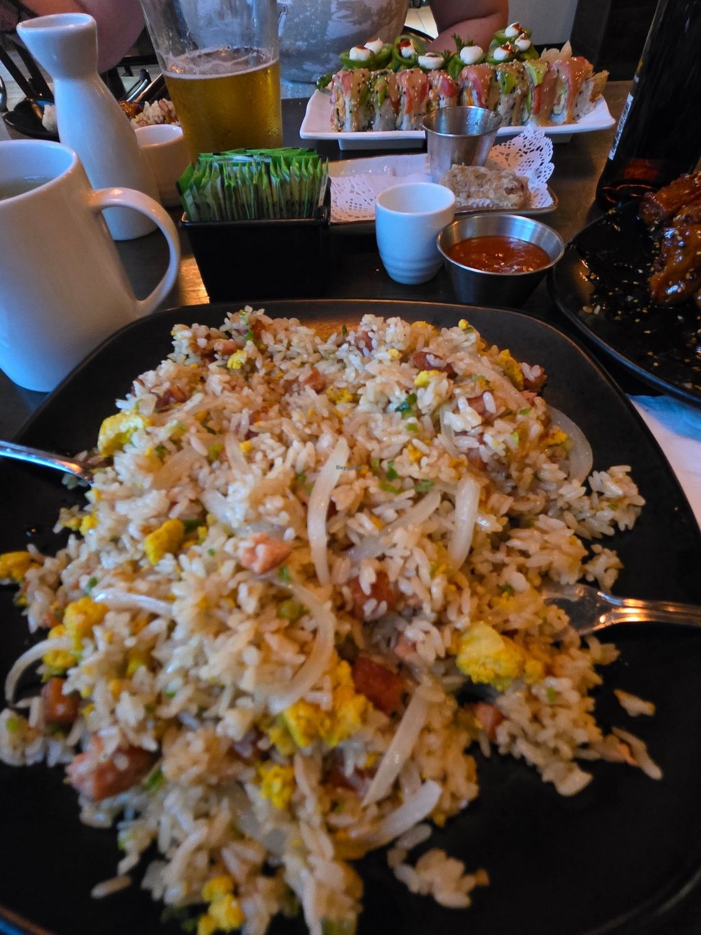 It is all vegan, the sushi is delicious, Raman is good(typical salty). They pan fry the rice and can do it with minimal oil if asked.