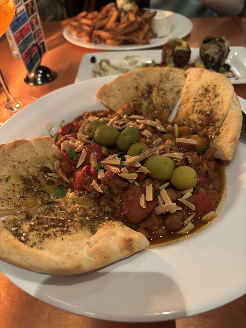 Enjoyed an appetizer of jalapeño-bean fritters, the vegan tagine for my main course, and vegan mint-oreo “cheesecake.” It was delicious. So many places, the vegan options are an afterthought, but this place had many options, clearly labeled, and were really tasty and unique.