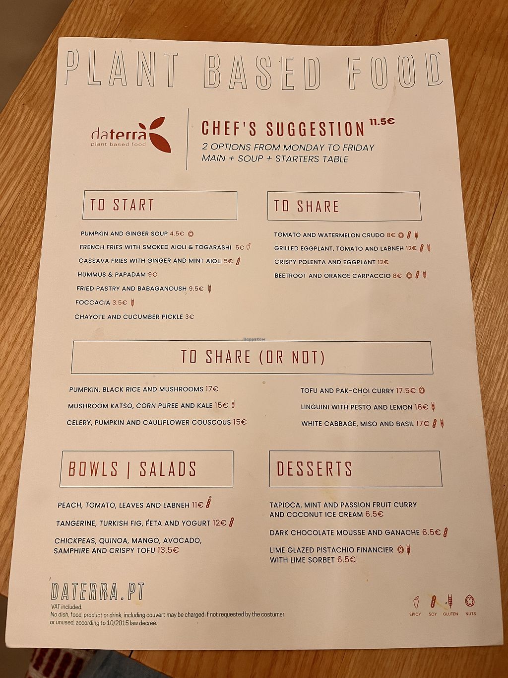 Porto doesn't have anywhere near the amount of plant-based/vegan restaurants/eateries that Lisbon does; however, daTerra came highly recommended and was a close less-than-10-minute walk from our apartment on the Ribeira, and their buffet offered us a good amount of choices all being 100% vegan. (And, too, the prices were cheap--can't complain about that!) Apparently, the buffet changes daily, so for our 3-night stay in Porto, we popped into daTerra twice (once for lunch; once for dinner). The staff on both occasions were simply terrific--a great group of people! For me, let's say two-thirds of the buffet was YUM; one-third was not to my liking. But, hey, that's a buffet for you: somethings are hits; something are misses--that's why you've got a large variety of food stuffs to choose from. Wines and beers were extra, but food and drinks are so cheap in Portugal that it didn't matter. The fancy desserts were extra, as well; but, again, who cares if it tastes great and is reasonably priced! In sum: daTerra's food rates a very solid 4-star rating from me, and I give it an extra star for the friendly service.