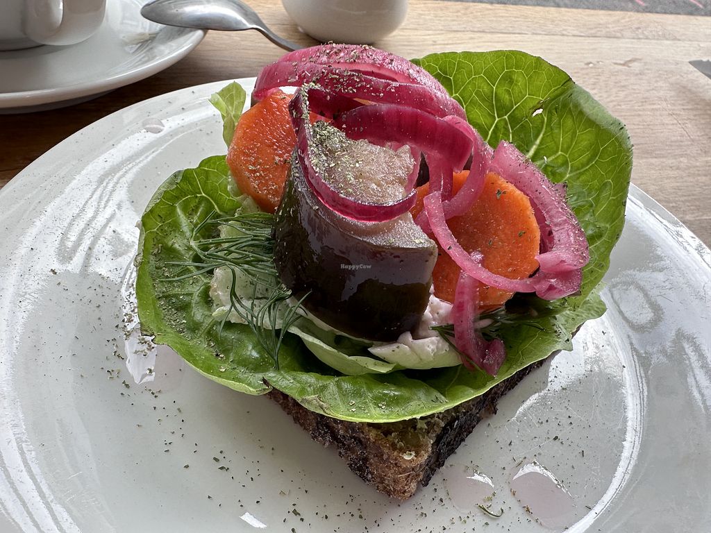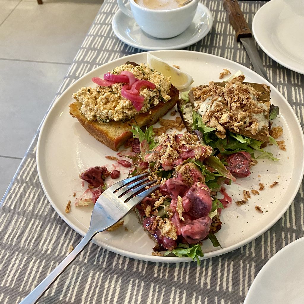 Scrambled tofu, seiten sausage on sourdough toast. Would definitely v…