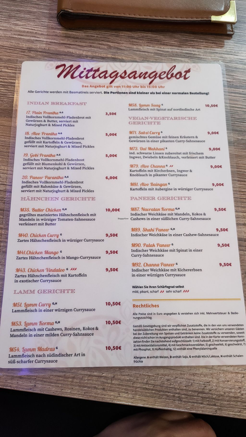 Serves meat, vegan options available. Indian restaurant with menu that clearly labels allergens. Example vegan offerings include samosas, naan, dhal, pani puri, pakora, chana masala and more. Open Mon-Thu 10:30-21:00, Fri-Sat 11:00-21:30.
