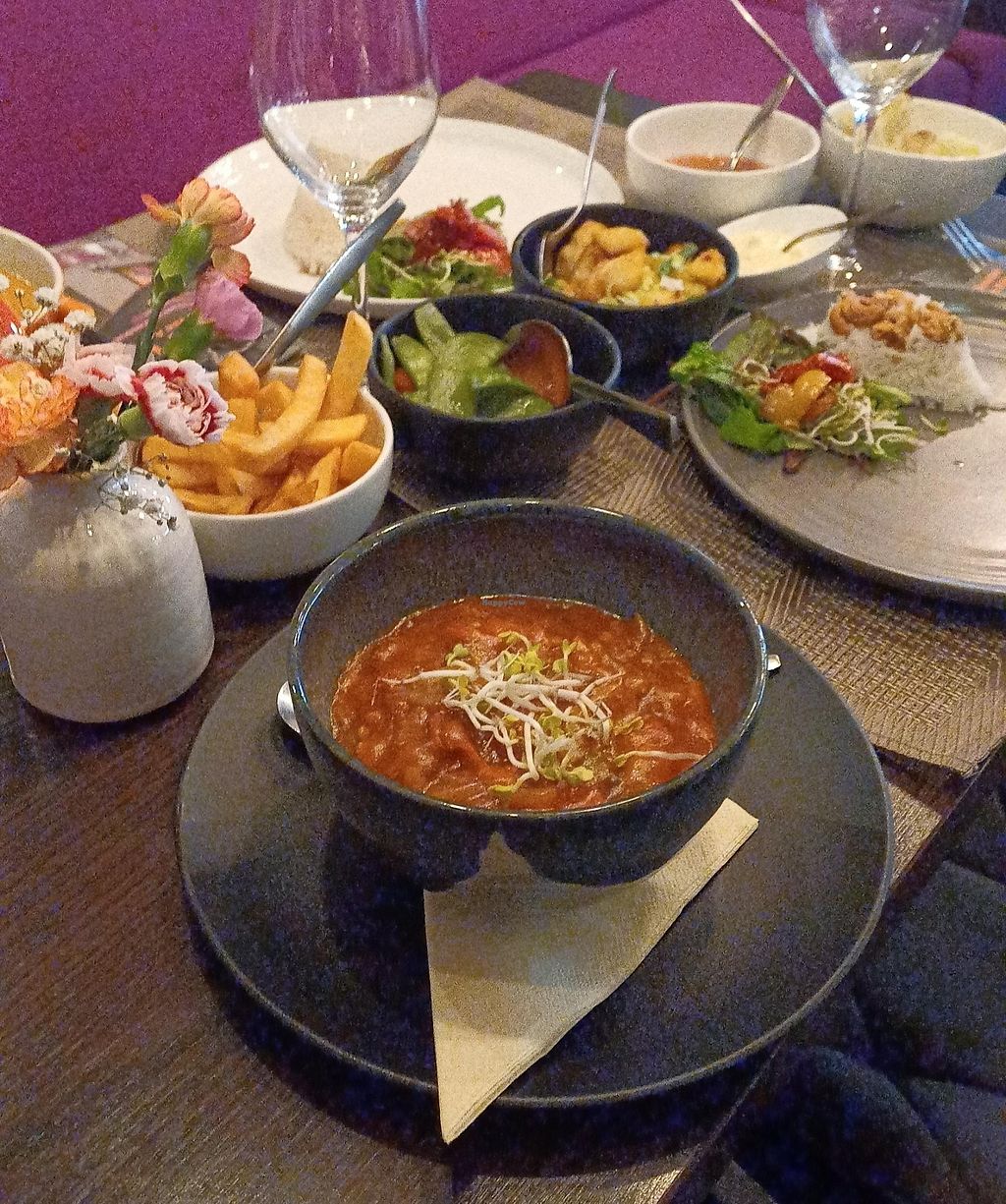 Serves meat, vegan options available. Restaurant offering vegan choices such as sweet potato curry, stroganoff and vanilla ice cream with whipped cream & strawberries. Open Mon 12:00-21:00, Tue-Sat 11:00-21:00, Sun 16:00-21:00.