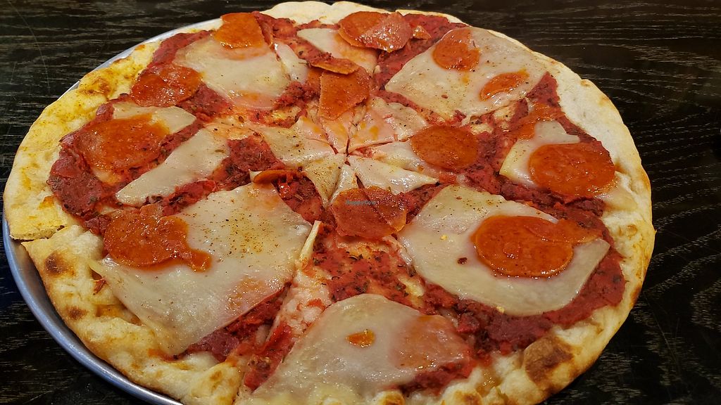 Pepperoni pizza. Homemade vegan cheese. $15.