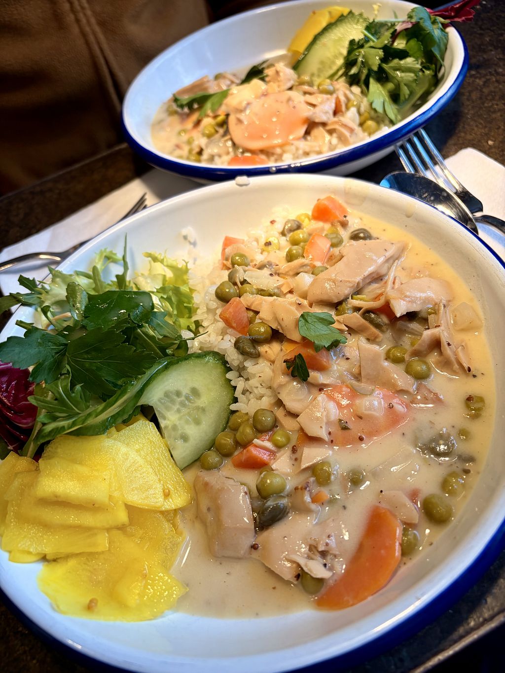 Eine wirklich kleine Location, aber wir haben einen Platz bekommen. Wir hatten die vegane „Hühner“-Frikassee, man war die gut! 👍 Und als Nachtisch gab es Tiramisu und Milchreis-Johannisbeer-Kuchen. Mega!