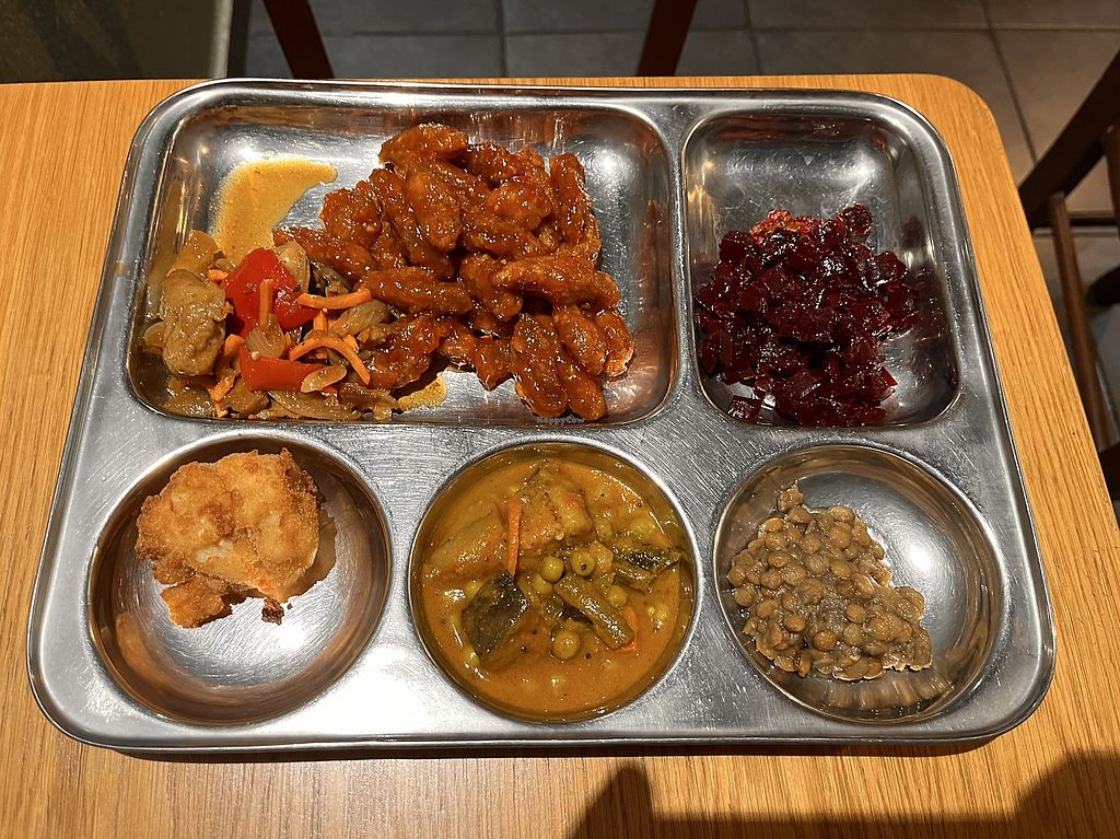 This place was so great! the Vegetarian Bhaba Beas is all veggie, signs tell you if it's gluten-free or vegan. It's easy to do, just choose what you want and you can have just a tiny bit if you just want to try it. It's really healthy too with sprouts and spicy kim chi!