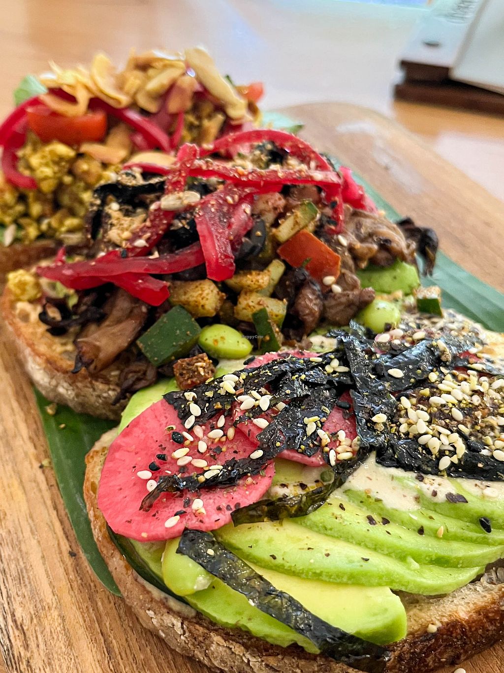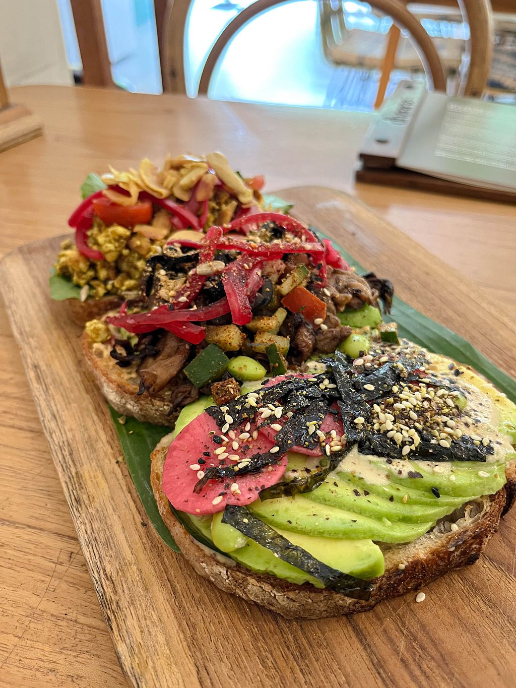 Ate here twice for breakfast. First time I had the green smoothie bowl and second time I had the salmon bagel sandwich. The make the ‘lox’ with papaya! It’s very good. My boyfriend also tried the avo toast trio. My favorite was the tofu scramble and he liked the wasabi one best.