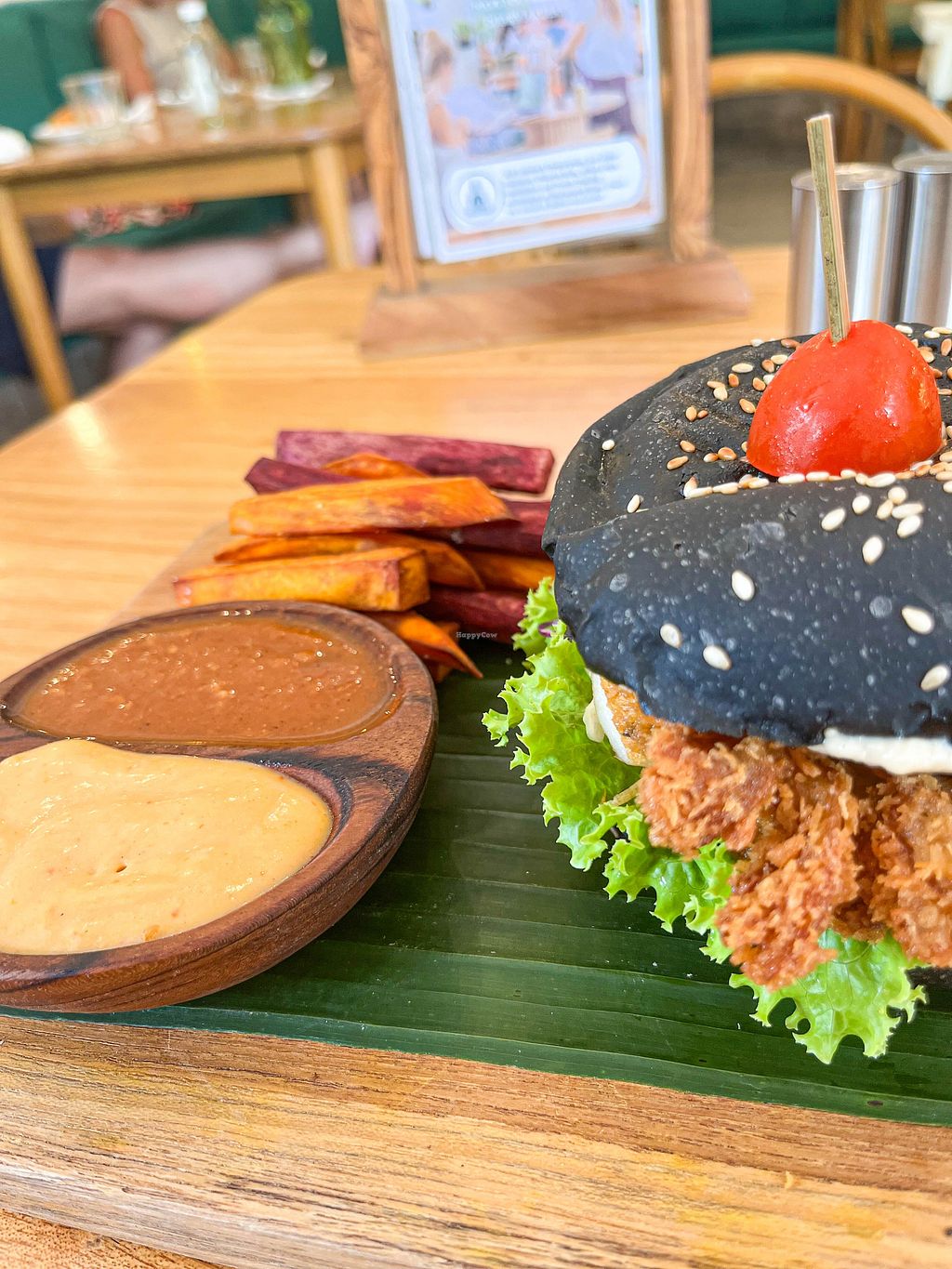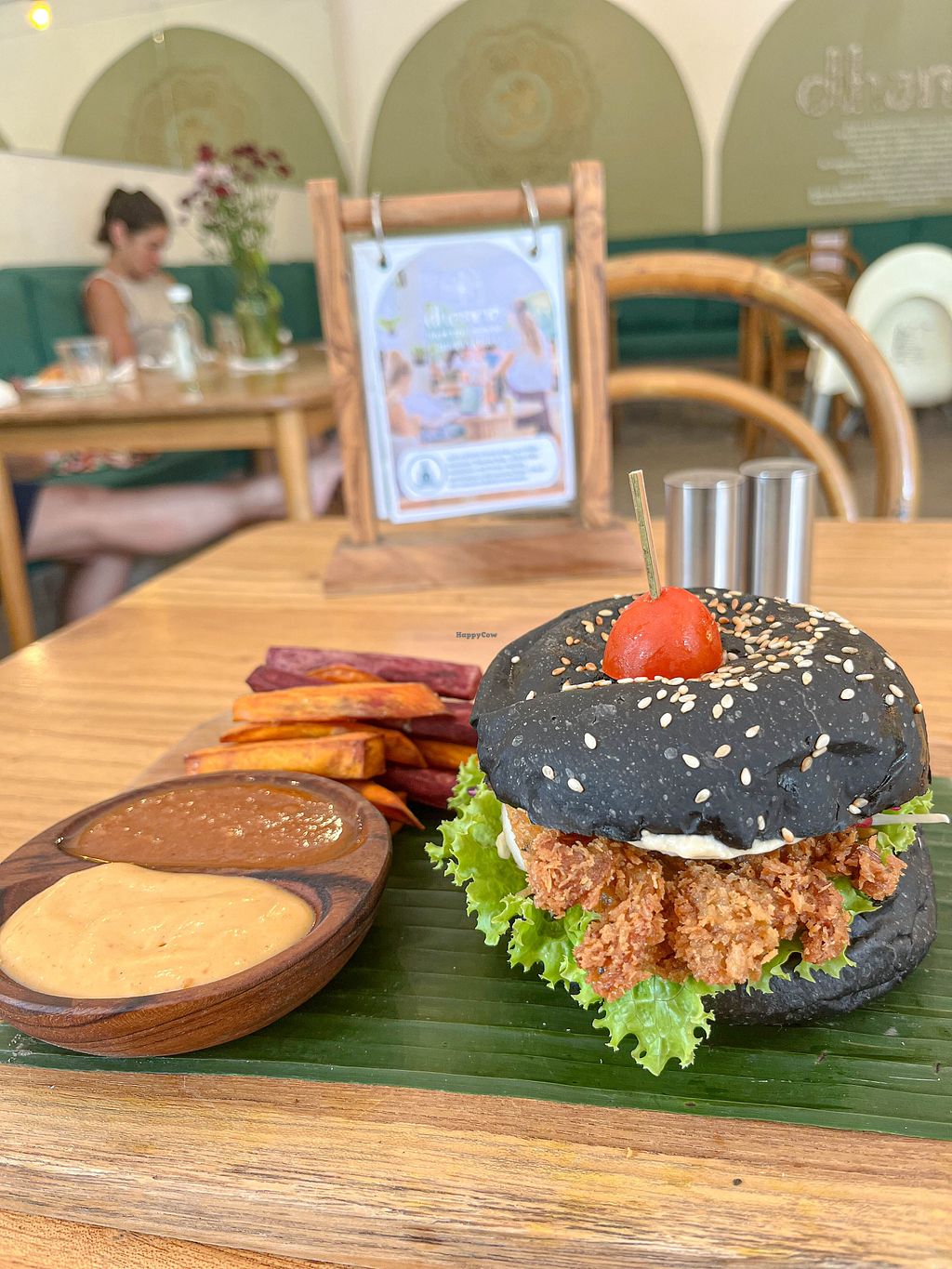 🍔 Lunch: The Fried Chickenless Burger was incredible. Crispy battered oyster mushrooms on a charcoal bun with slaw and vegan mayo, served alongside baked sweet potato fries tomato sauce, and sambal mayo — a perfect balance of indulgent and satisfying.