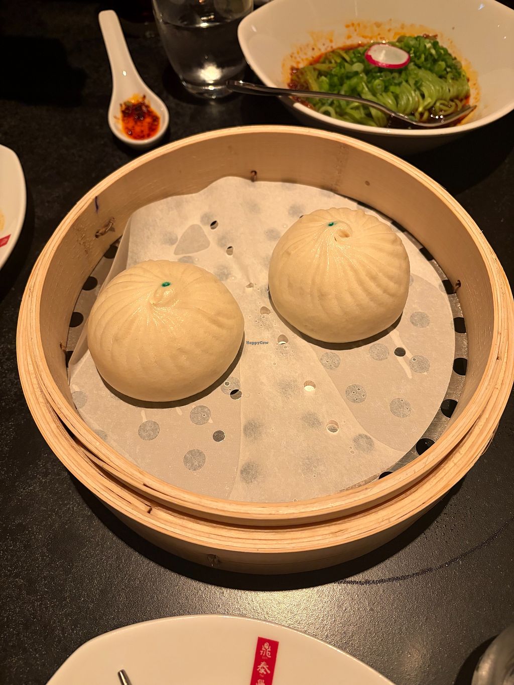 Serves meat, vegan options available. Chinese restaurant specializing in xiao long bao, or soup dumplings. Vegan options include vegan bao buns, vegan dumplings, vegan noodles with sesame sauce, vegan spicy noodles, vegan spicy wontons or wonton soup, vegan Shanghai rice cakes, and vegetable dishes such as cucumber salad, seaweed and bean curd salad, soy noodle salad, wood ear mushrooms in a vinegar dressing, and a variety of greens. Open Mon-Thu 11:00am-9:00am, Fri 11:00am-10:00am, Sat 10:30am-10:00am, Sun 10:30am-9:00am.