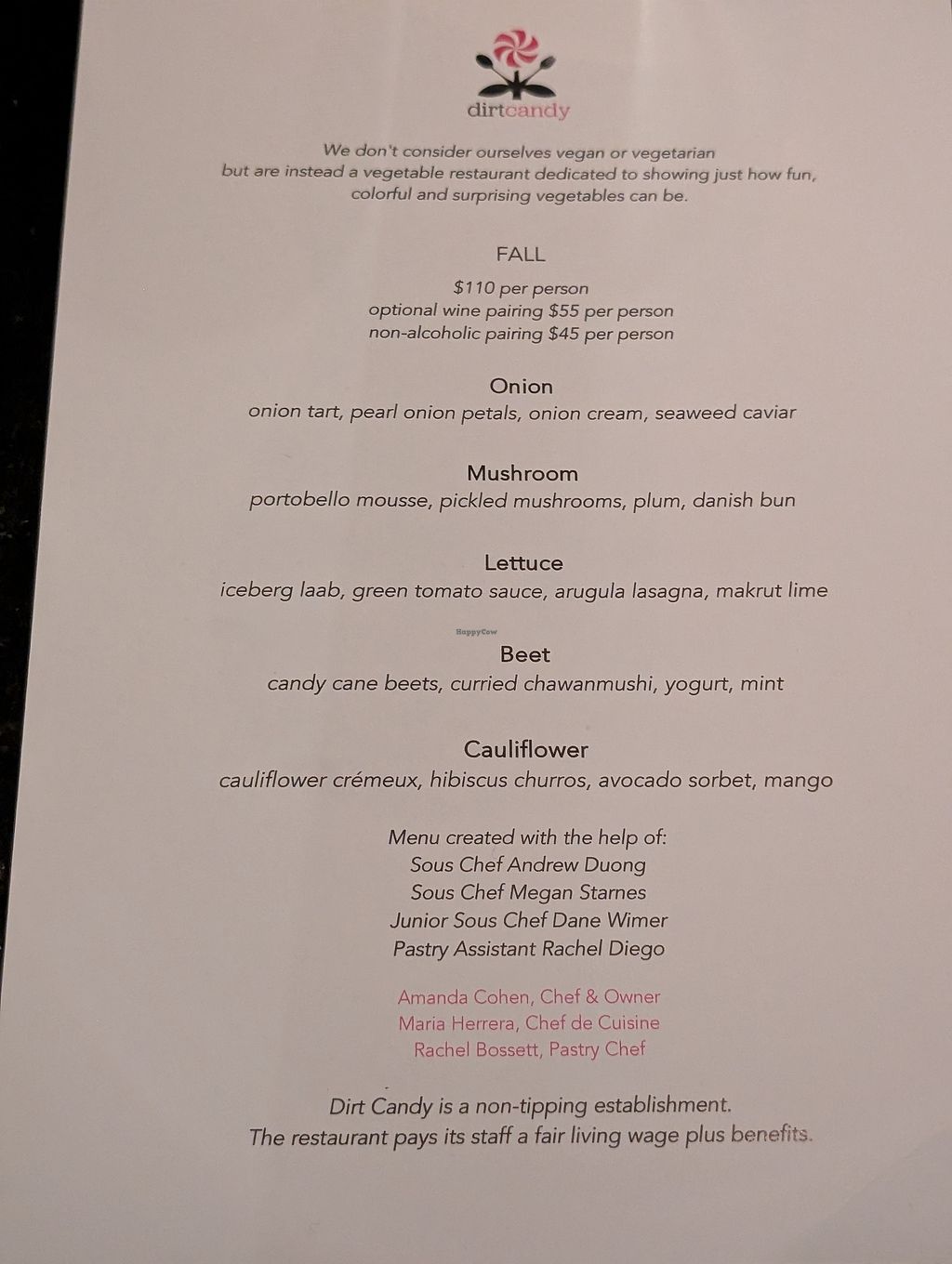My photos are from 2018, menu is ever changing. Our experience was fantastic. delicious and beautifully prepared meals, great wine pairing. You can see everything being prepared with an open kitchen in the center of the dining room. A bit pricy, but its worth the experience at least once! If price is a concern, for less money there are other fantastic vegan restaurants in NYC too! I would love to go back. Recommend booking far in advance.
