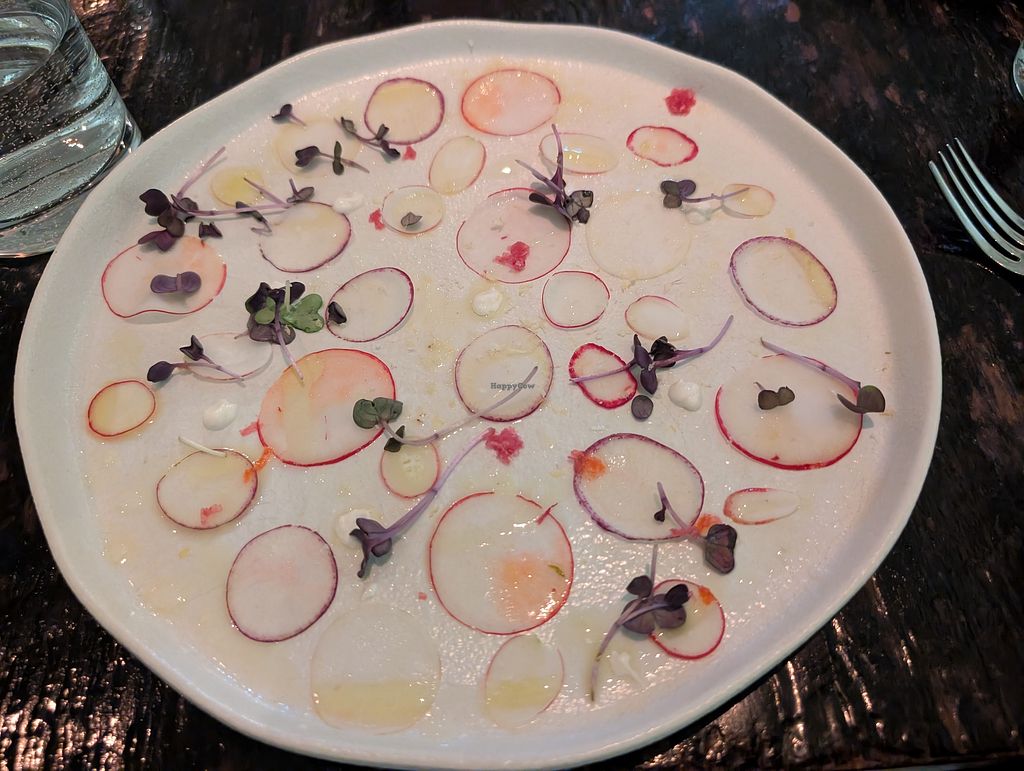 Loved it! One of the better "fancy" vegan meals I've had. I liked everything they served and I left full!. It's a 5 course prix fixe but they apparently always give some extra surprises, so in my experience it ended up being 8 courses. It's a vegetarian restaurant but they are prepared to veganize everything. The waiter actually asked us when we sat down if anyone in our group was vegan (which we all were). I would love to return here for a future prix fixe!