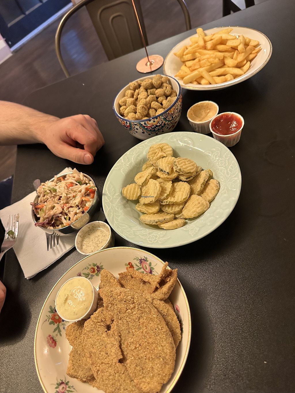 fried pick;es, hush puppies, collard greens, cornbread, vegan fried chicken and all my other favorites at this place!