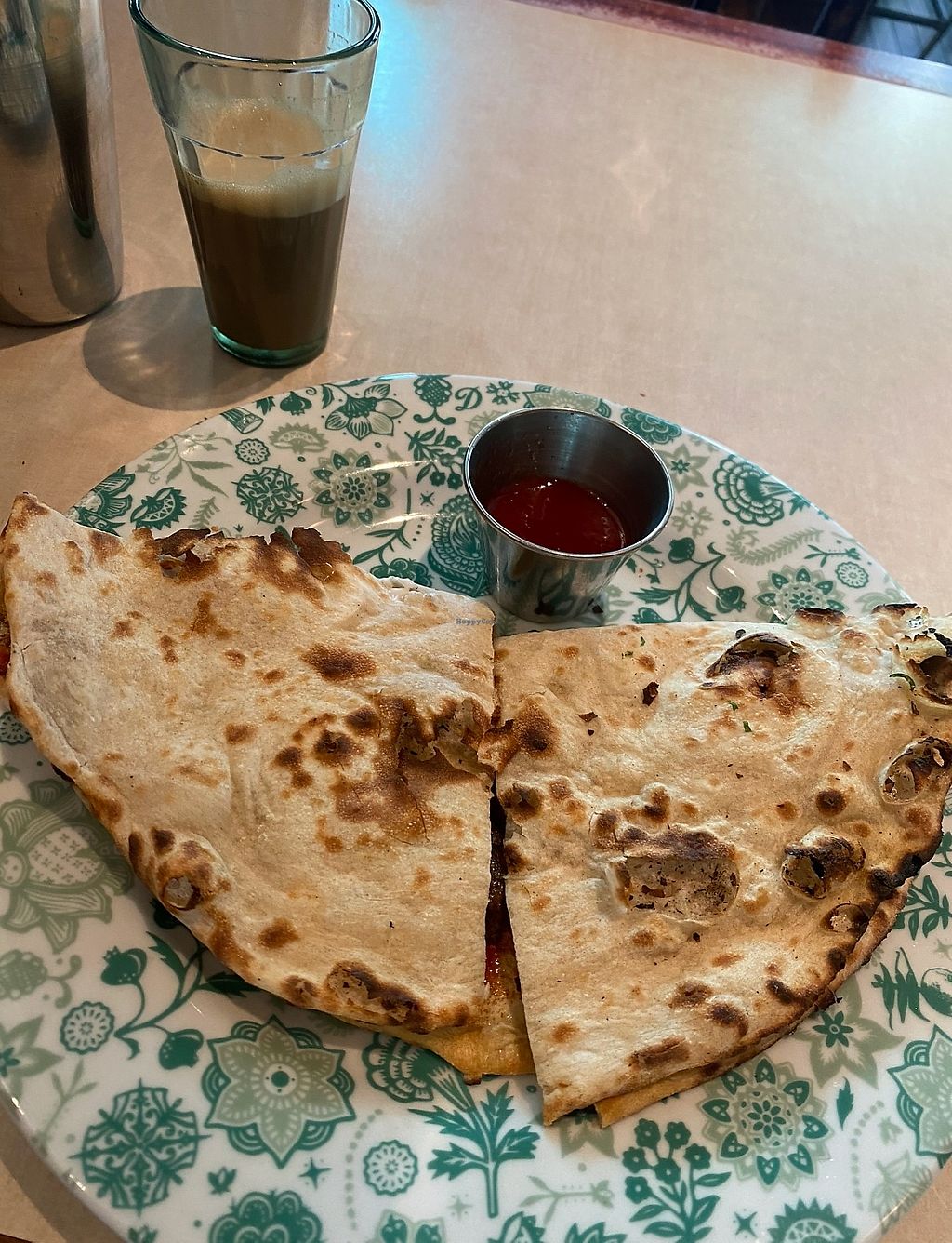 Really nicely-decorated restaurant and a nice vibe, very friendly staff. I had the vegan sausage naan wrap for breakfast with a side of masala beans and an oat milk chai. The chai was lovely and the beans flavourful. Unfortunately the vegan sausages didn’t have much flavour or texture, and the wrap contained an unspecified white sauce (not mentioned on the menu) and a very overpoweringly sweet chutney which masked any other flavours. Could’ve done with maybe some greenery or other texture, and less of the sweet sauce.
