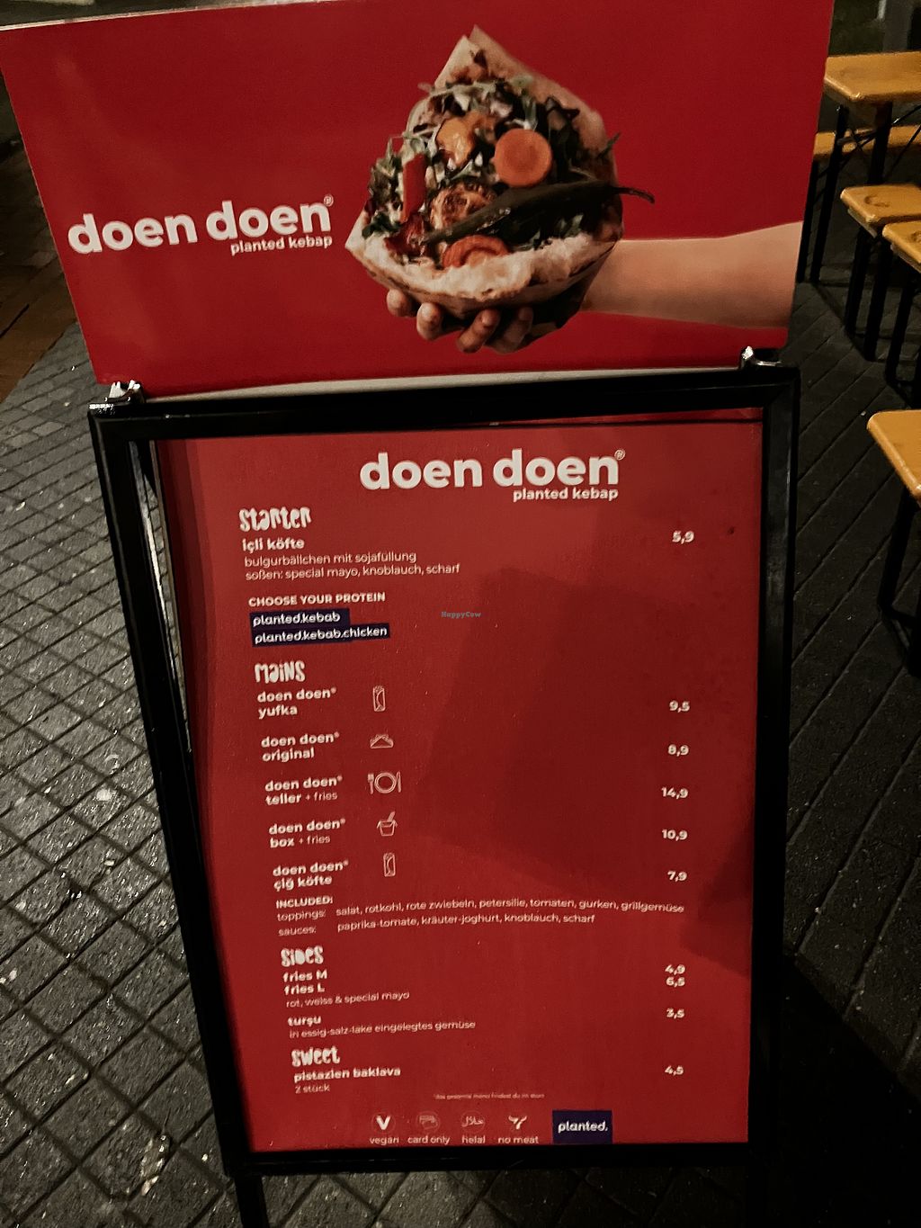 Tried the Doen Doen Original with everything. First off—the bread was a standout. Freshly toasted, it had that perfect contrast: crispy on the outside, warm and fluffy on the inside. The planted seitan leaned more toward a chicken flavor than a traditional kebap, which I actually enjoyed. The Kebap came packed with all the usual suspects—red onions, cabbage, lettuce, tomatoes—and the addition of grilled veggies was a nice touch. Portion-wise, it was generous and fairly priced, about what you'd expect at most kebap spots these days.