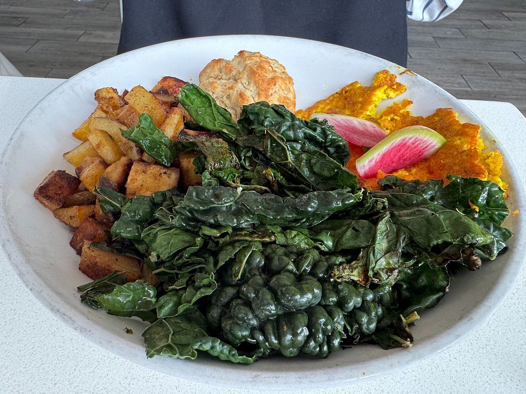 The Motherlode - tofu scramble, home fries, greens and biscuit. Yum.