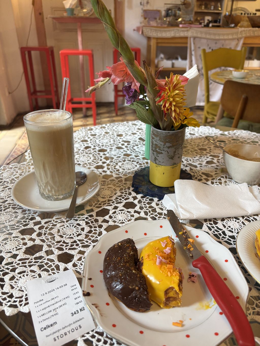 It‘s a tiny beautiful cafe. The owner had a choice of freshly baked donuts, on the day we were there , there were 2 vegan options. Homemade lemonade (we had the rose-lemonade and raspberry , both really good) and choices of coffee with milk alternatives are available.