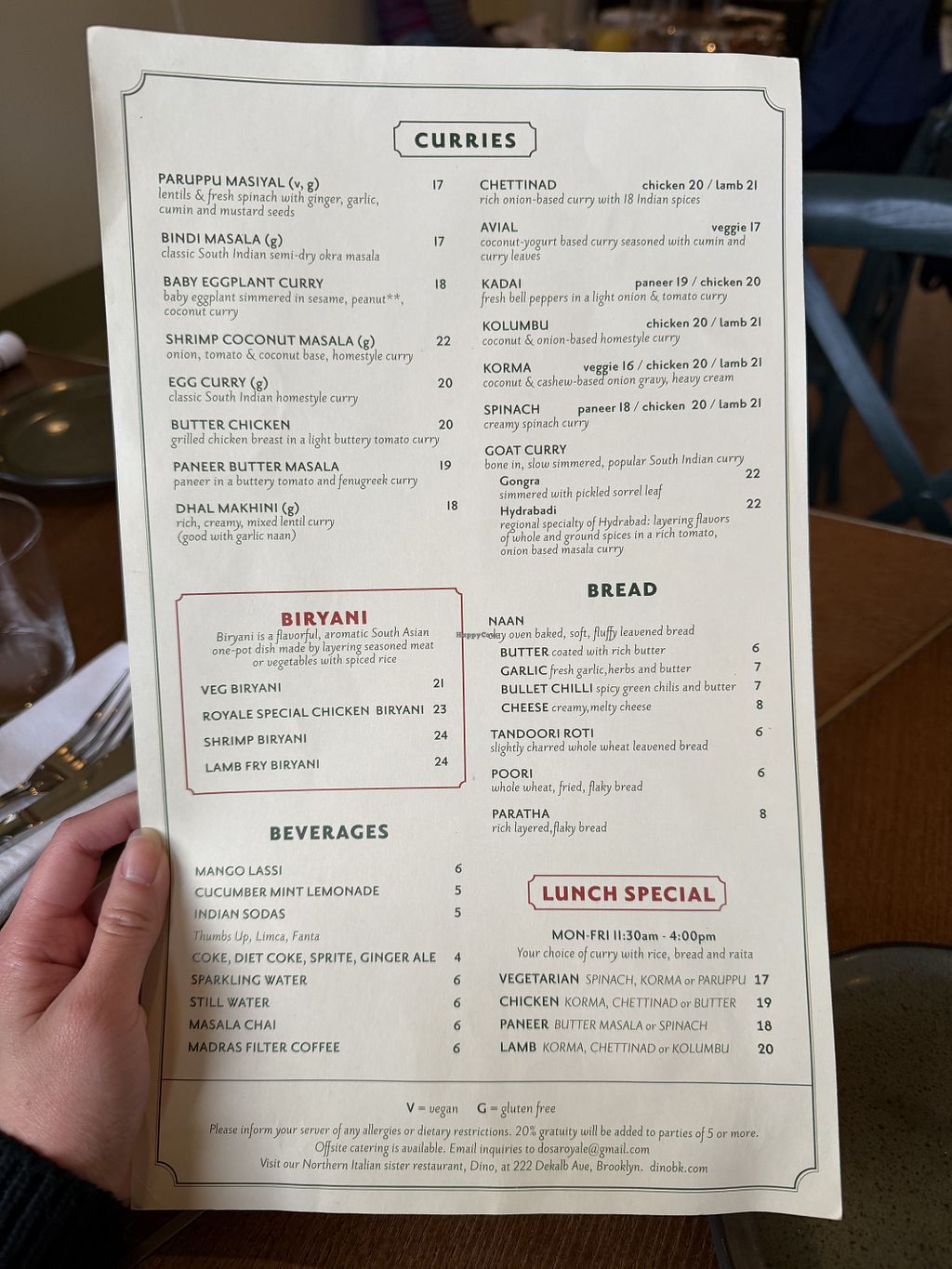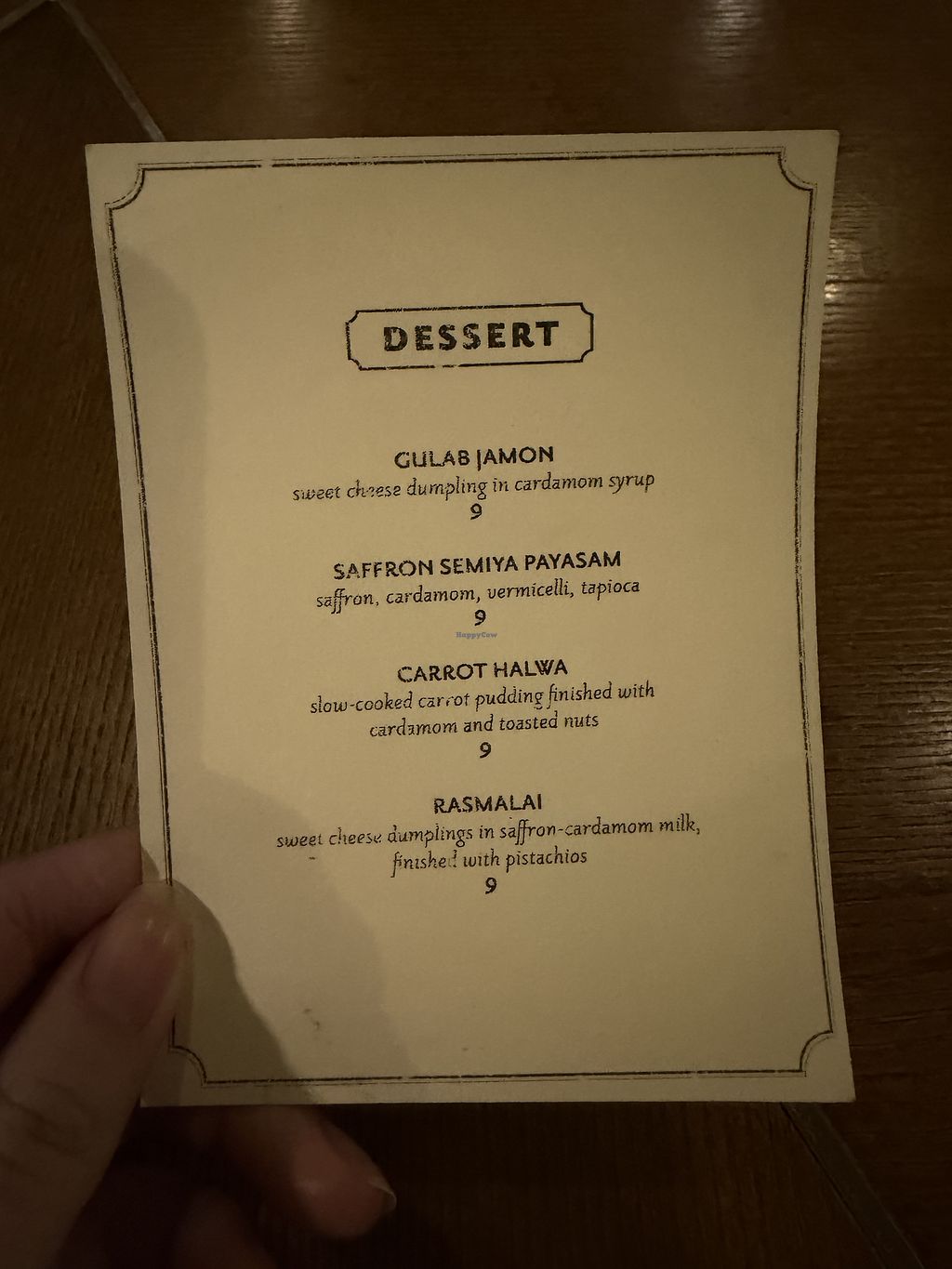 Vegan options (no ghee), quick friendly service, reasonable prices, tasty sauces and fillings. We had veg soup, hot and garlicky, saag paneer and masala potato dosas. Curries, rice, samosas and other veg options on the menu. Looking forward to going back.