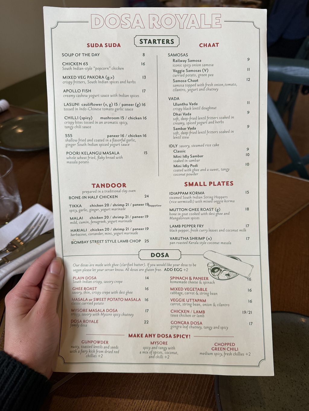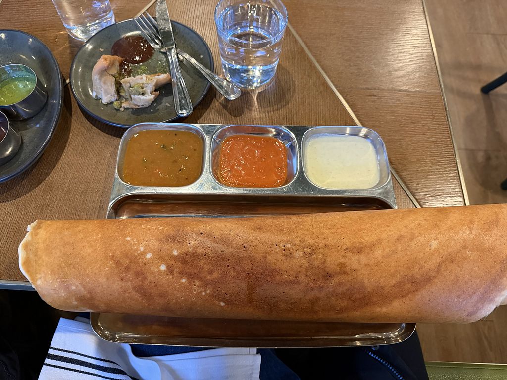 - Mixed Vegetable Dosa (made vegan without ghee): The vegetable filling seemed slightly lackluster and small serving compared to the size of the dosa; the dosa itself was good but not great