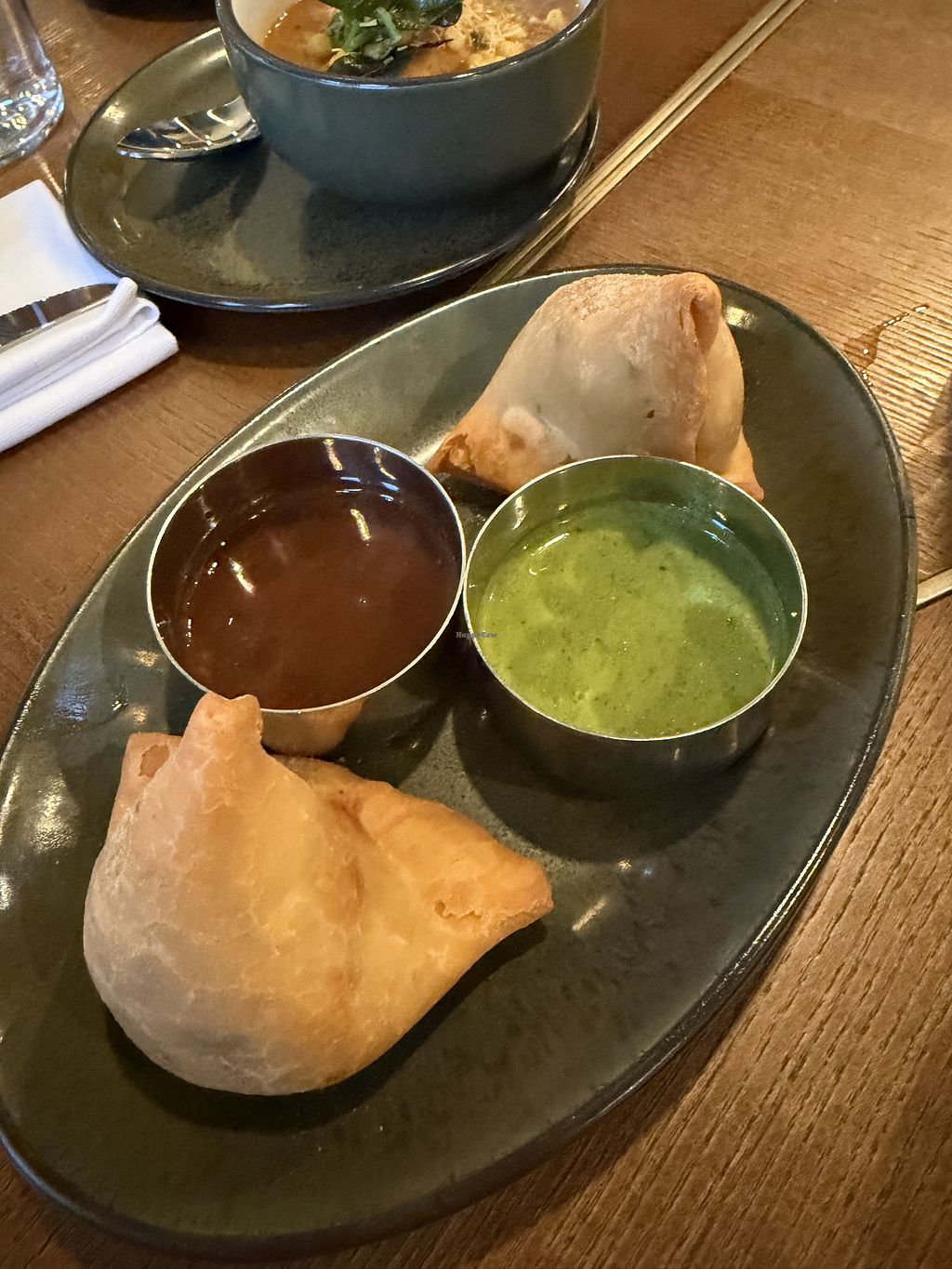 - Veggie samosas (vegan) : Solid flavor but dough/texture seemed slightly undercooked