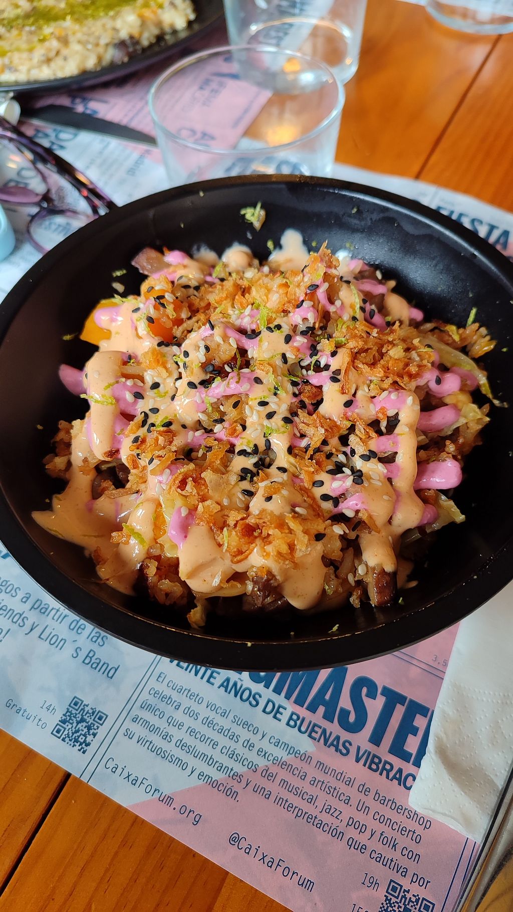 Toda la carta tiene pintón, nos costó un montón elegir comida. Al final nos decantamos por unas bravas para compartir, unas croquetas, el sando tofu, durum güeno, risotto y arroz frito. Sin duda el plato que más nos gustó fue el risotto, muy cremoso y un sabor increíble. Las bravas estaban de locos y de las croquetas esperábamos más picante pero están muy buenas.