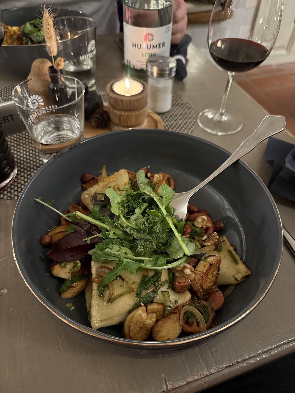 Spinach Dumplings on lentil-apple salad with fried rocket and nuts