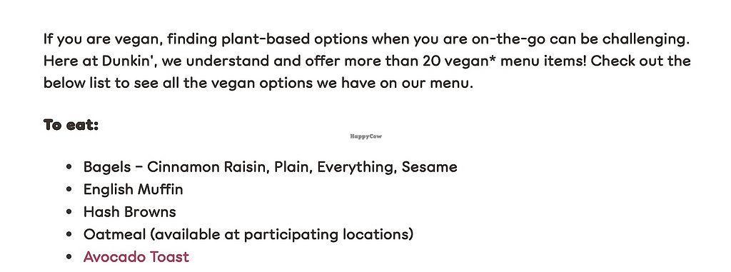 Long-established US donut & coffee chain that may have a couple vegan options including hash browns, a few of the bagels, and plant milk for coffee. In some areas they have introduced vegan donut options. Coffee shop offering almond milk and oat milk as alternative milk options. Vegan breakfast items include avocado toast, hash browns, English muffin (no butter), oatmeal (at select locations), and bagels without cream cheese (cinnamon raisin, plain, everything, sesame). Open Mon-Sun 6:30am-8:00pm.