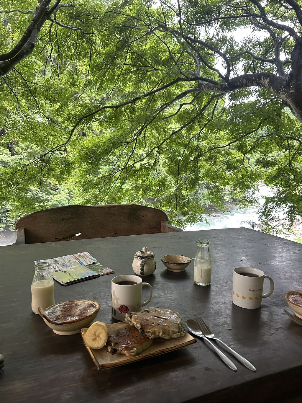Pros: vegan blueberrry pancakes & soup, swim in the river anytime, lounge area overlooking the river