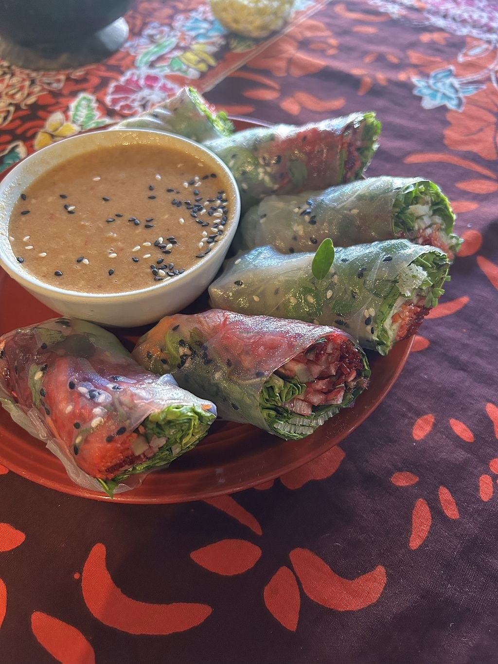 fresh veggie spring rolls🌿 so so good, with peanut sauce