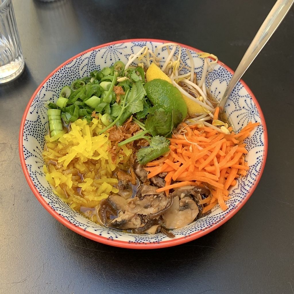 There are two full dishes with vegan option. I found the one with coconut milk to be tastier and more full of flavors, also the pasta of the Laska was better than the vegan Ramen. Very appropriate for people with kids as they have a park right in front where you can eat while your kid plays. Very convenient. The pad Thai is not vegan as they add fish sauce and don’t have the option of ordering without it.