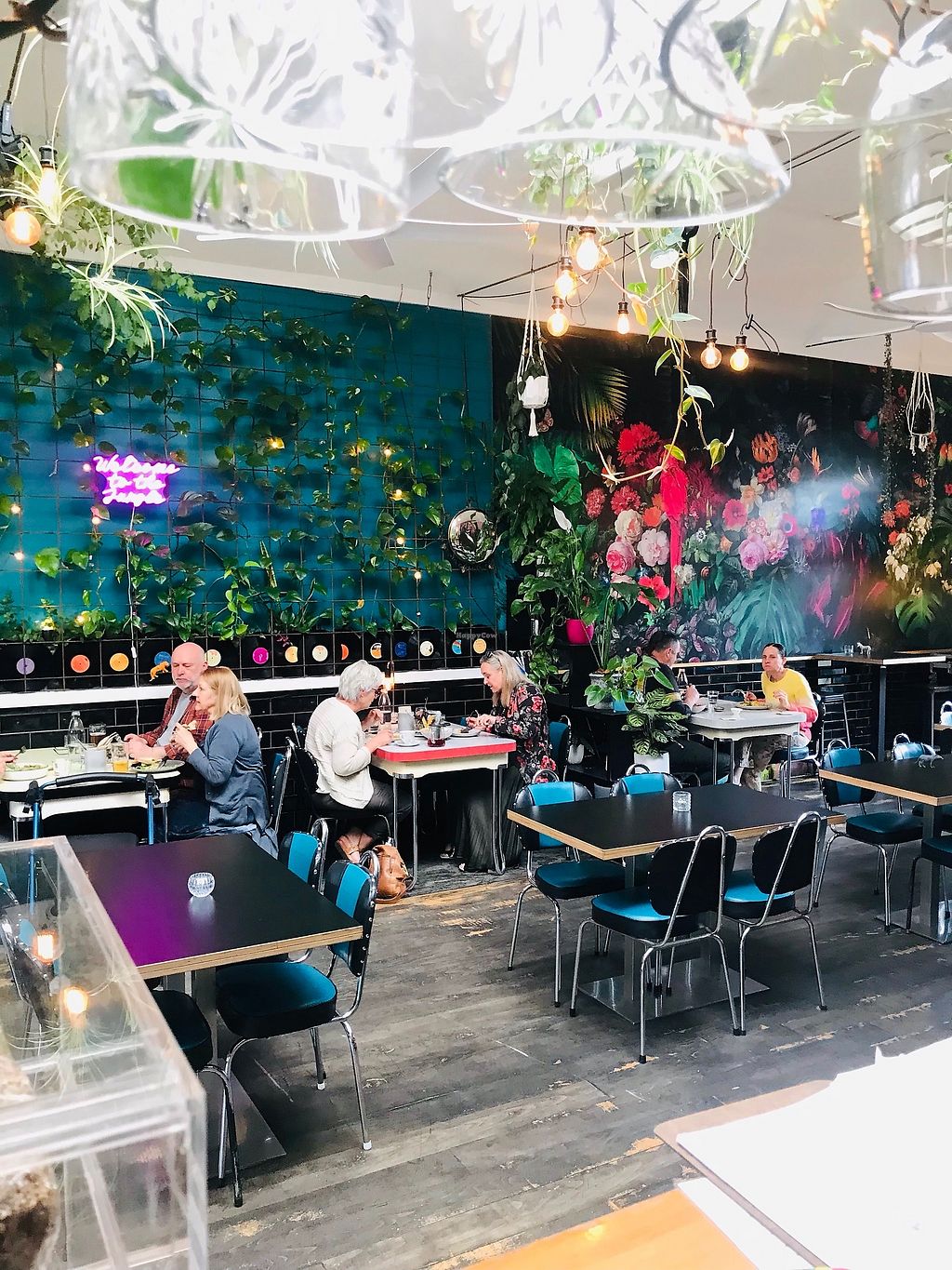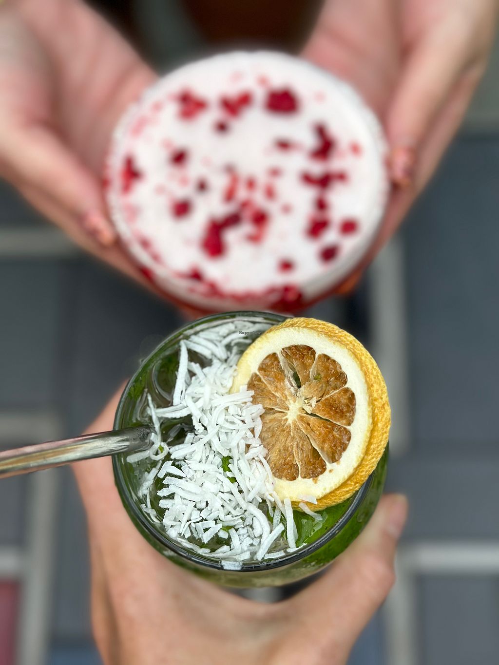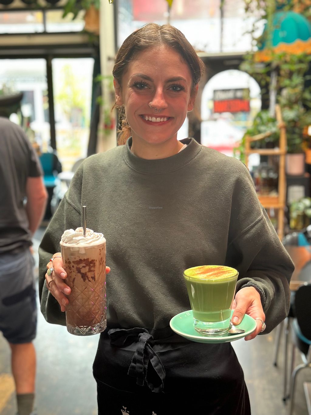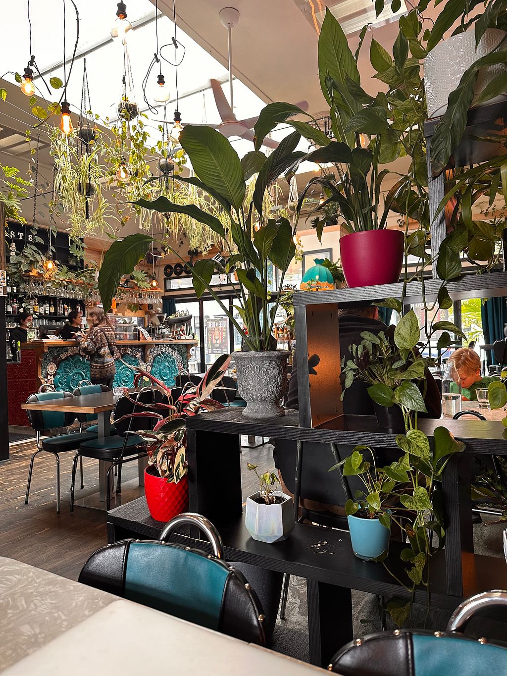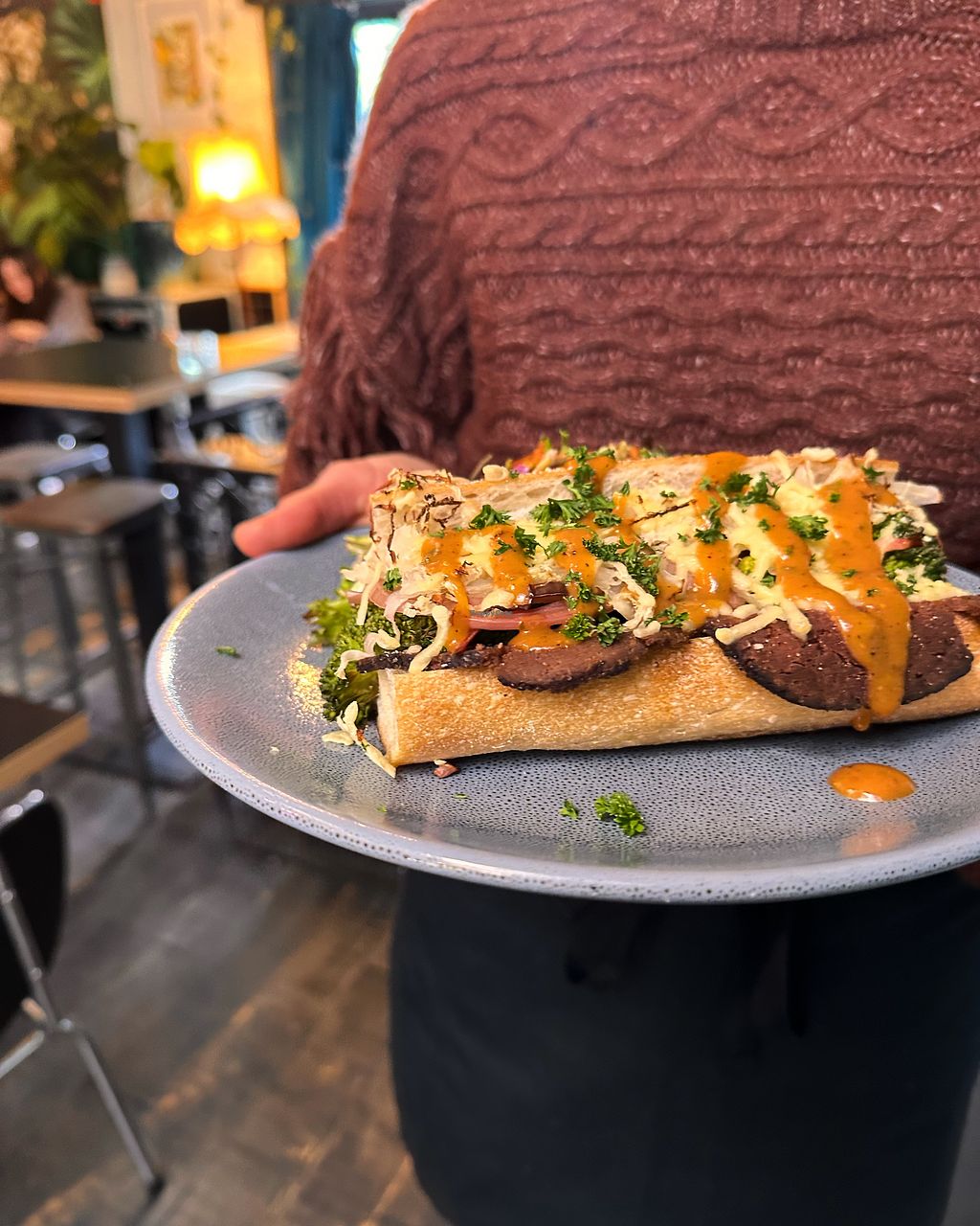 Stuffed mushrooms over a veggie fritter and mashed vegetable based