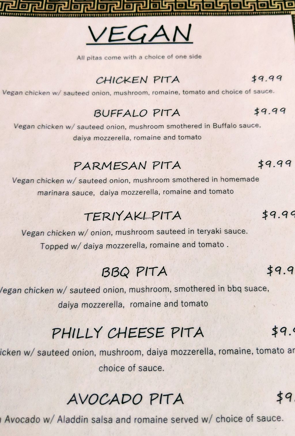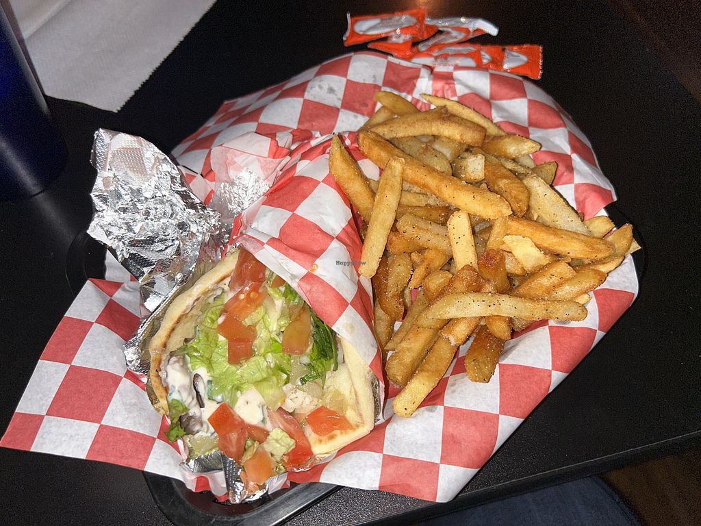 We stopped by here for lunch today because we saw they had a lot of vegan options. Everything on the regular menu is clearly labeled as vegan. They also have 2 separate vegan specific menus-one for vegan burger options and one for vegan pitas. We each got a pita: vegan chicken Schwarma and vegan beef gyro. The chicken one was like cut up beyond nuggets or something and the beef was a cut up beyond burger patty. It’s good if you want more of a fast food taste but I didn’t feel like we were eating at a Mediterranean place based on the taste of the pitas. They just tasted like a burger in a pita and a chicken patty in a pita. Can’t say we would go back but if you’re a new vegan and want the fake meat options, definitely check it out.