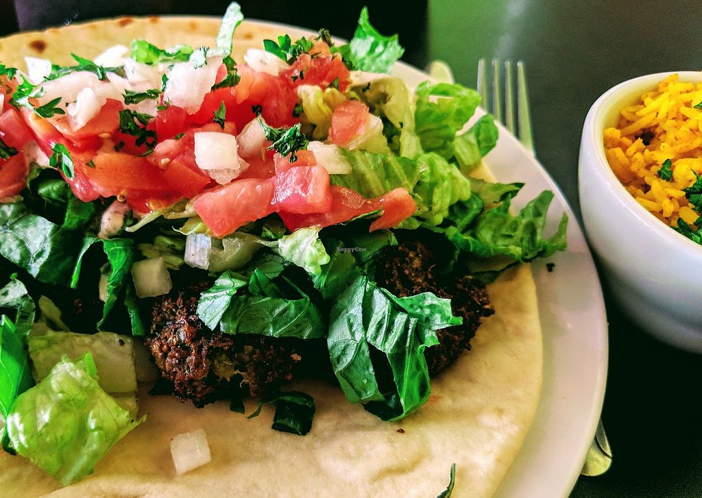 Found this restaurant on this app and decided to check it out. It’s a casual spot where you order at the counter but there is plenty of seating. Ordered falafel with vegan tzatziki “lunch” size. There’s a separate vegan menu but many of the vegetarian things can be made vegan easily.