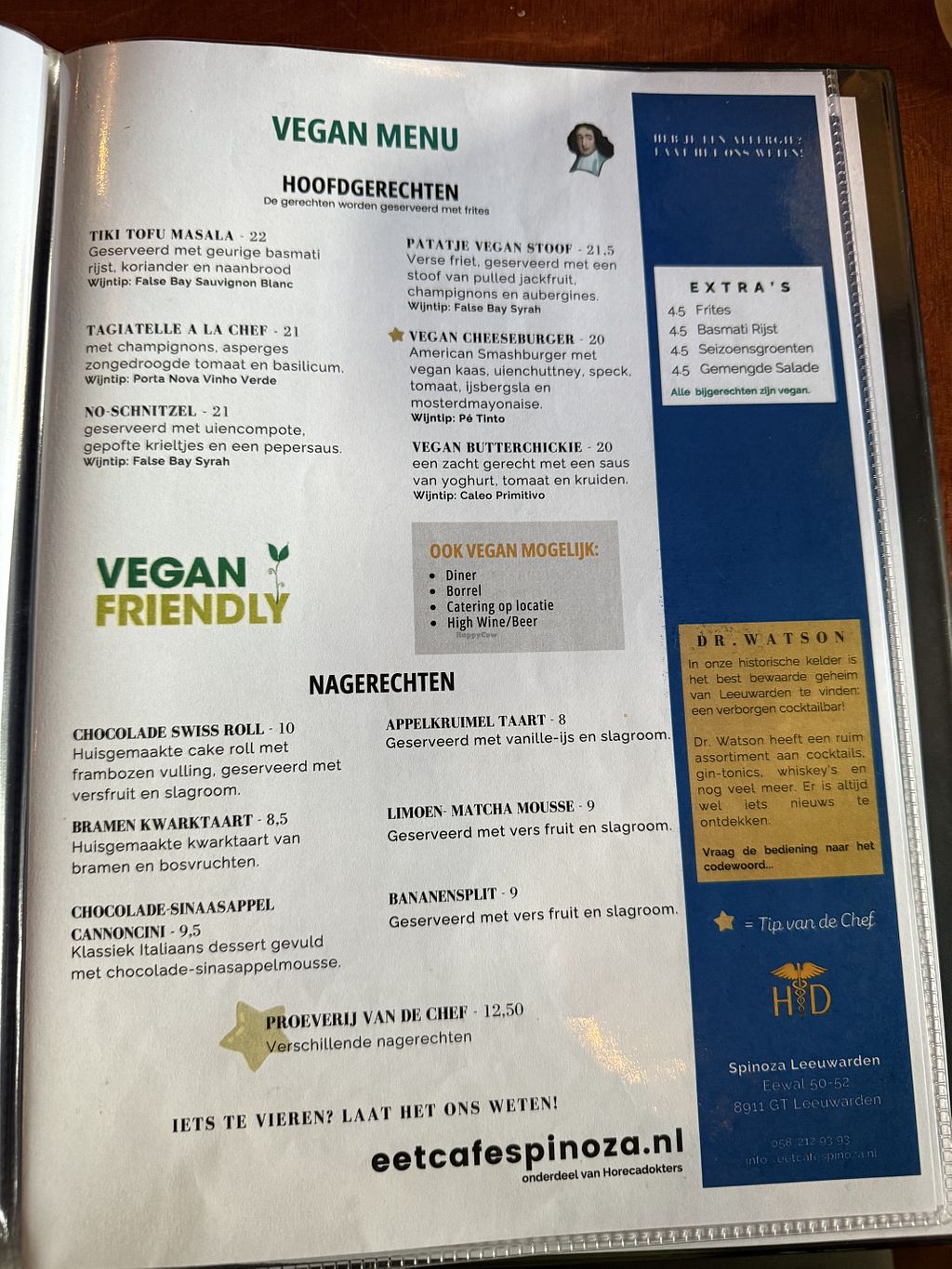 Een uitgebreide vegan kaart, fijn dat er veel keuze is. Daarnaast ook meerdere dessert om uit te kiezen ipv alleen sorbetijs. Leuke zaak om te eten met een gezelschap waarbij niet iedereen veganistisch eet.