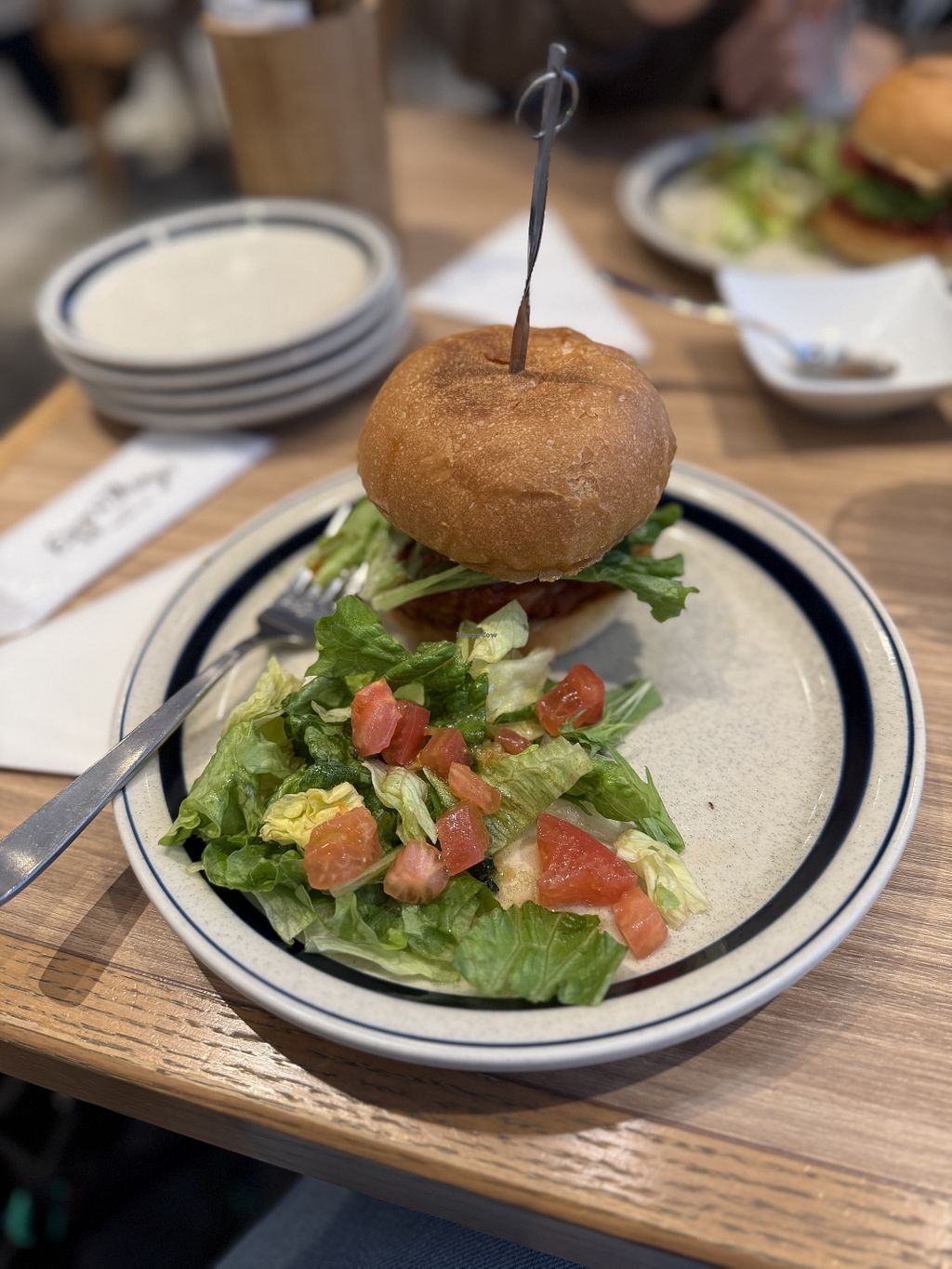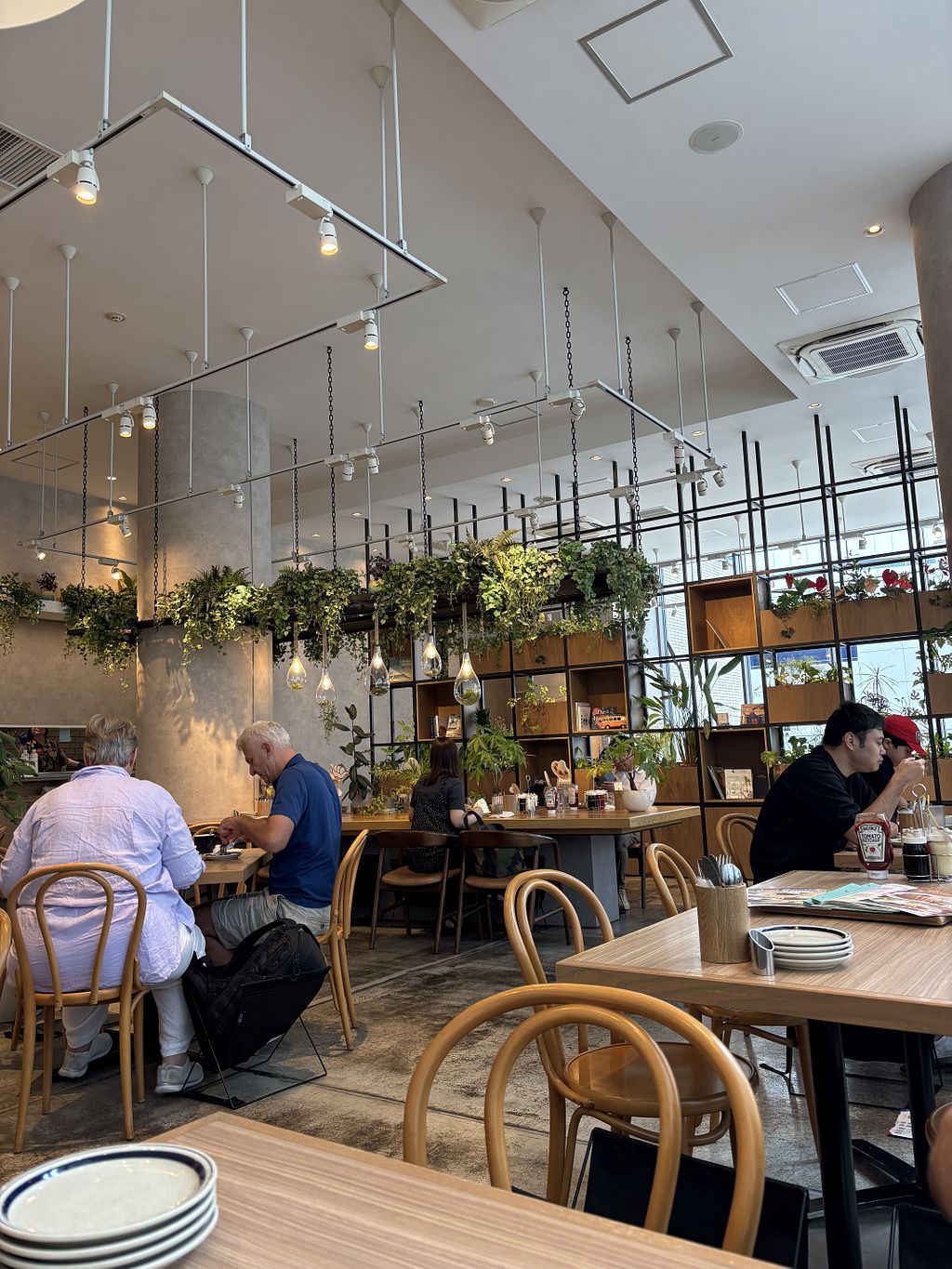 Stopped here for a burger which was very tasty. A little unique from American veggie burgers which is refreshing. Also got a lemonade and it was a nice size not tiny little glass. There’s plenty of seating available and it’s a very cute interior with lots of plants😄staff was kind too. The burger came with a small side salad which was very plain. I wish there were more side options available and a better salad with more ingredients.
