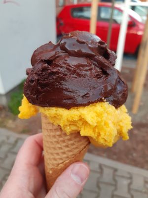 We usually go there first when we want to go for a walk by the Rhein river. The queue can be very long, but it's also very good ice-cream with very big portions. Some flavours are on the menu every day, some are changing. Unfortunately, they don't always have vegan dark chocolate. So sometimes only the fruit sorbets are vegan. (Maybe check their Facebook in advance.) However, the cones are vegan, and they have a chocolate coating which is vegan too - only recommended if it's not too hot, might be messy at 30 degrees.