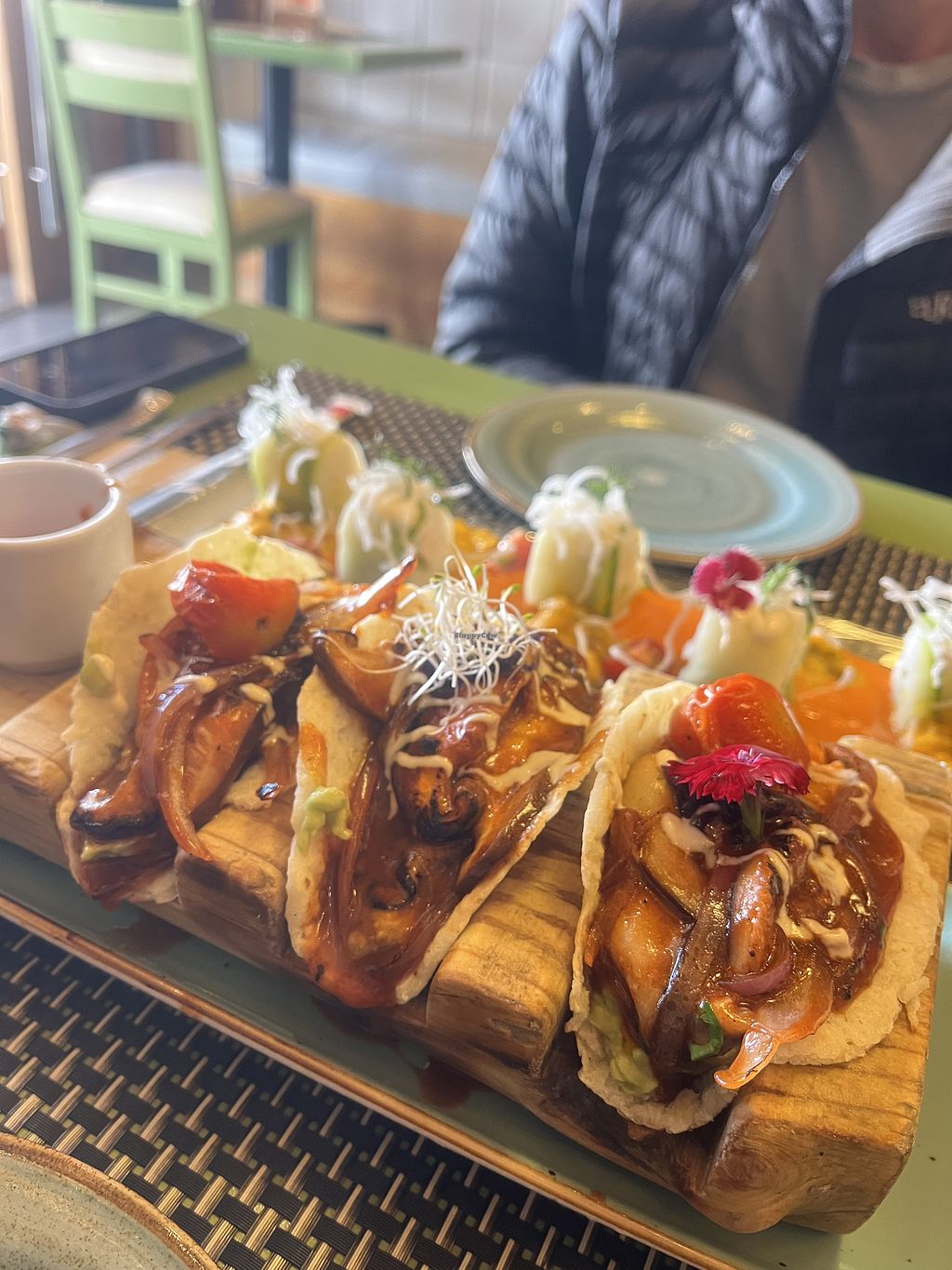 came here for dinner one evening and the food was really good. The spot is right on the plaza which is very convenient. menu is all veg but many dishes are vegan. Had their ceviche dish and my partner had the tacos.