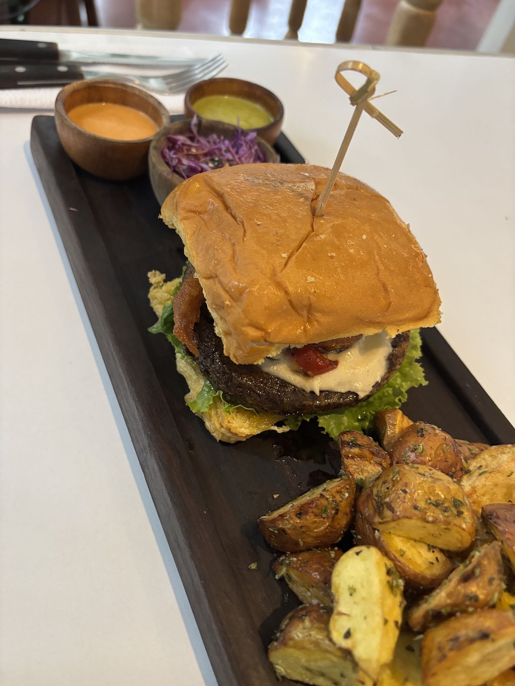 I had a burger instead of in a bun, it was surrounded by a whole avocado. It was very nice.
