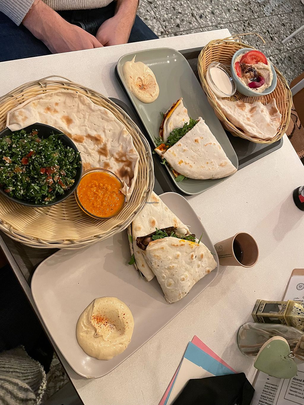 Manakish with different fillings, Dips, Tabouleh, everything was very good! Many vegan options, clearly labelled. The price was reasonable!