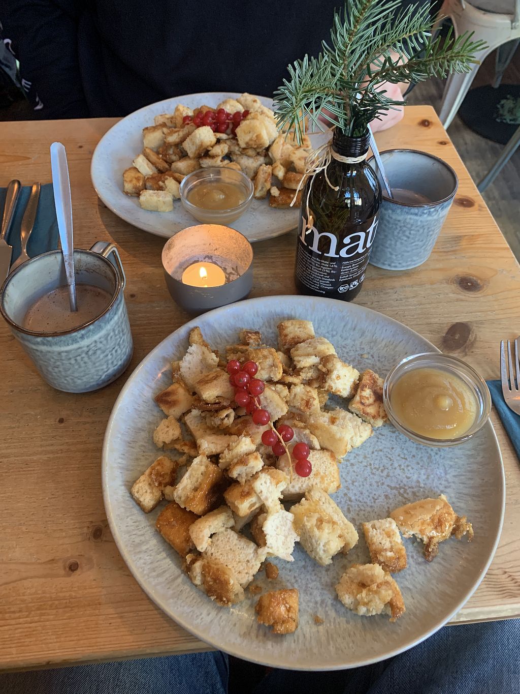 Mein Mann und ich waren sehr begeistert. Die heißen Getränke mit Hafermilch waren super. Die Frühstücksauswahl fiel sehr schwer, weil sich alles ganz toll angehört hatte. Wir haben uns für Pancakes mit Pistaziensoße und dem Ulrimate Frühstück (Tofu Scramble, Beyond Meat Bratwurst, kl. Pancake, Obazda und Brot) und eine Zimtschnecke entschieden. Sehr zu empfehlen