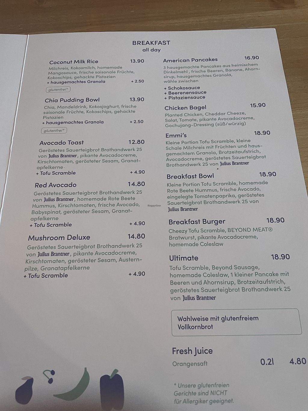 Wir hatten die Pancakes (sehr gut!) und das Avocado Toast mit Scrambled Tofu (ganz okay, Tofu war leider kalt und die Portion war eher klein). Und hat es insgesamt gut geschmeckt, aber die Preise fanden wir echt heftig. 18€ für eine kleine, dünne Scheibe Brot mit Avocado und Tofu ist mMn nicht gerechtfertigt.