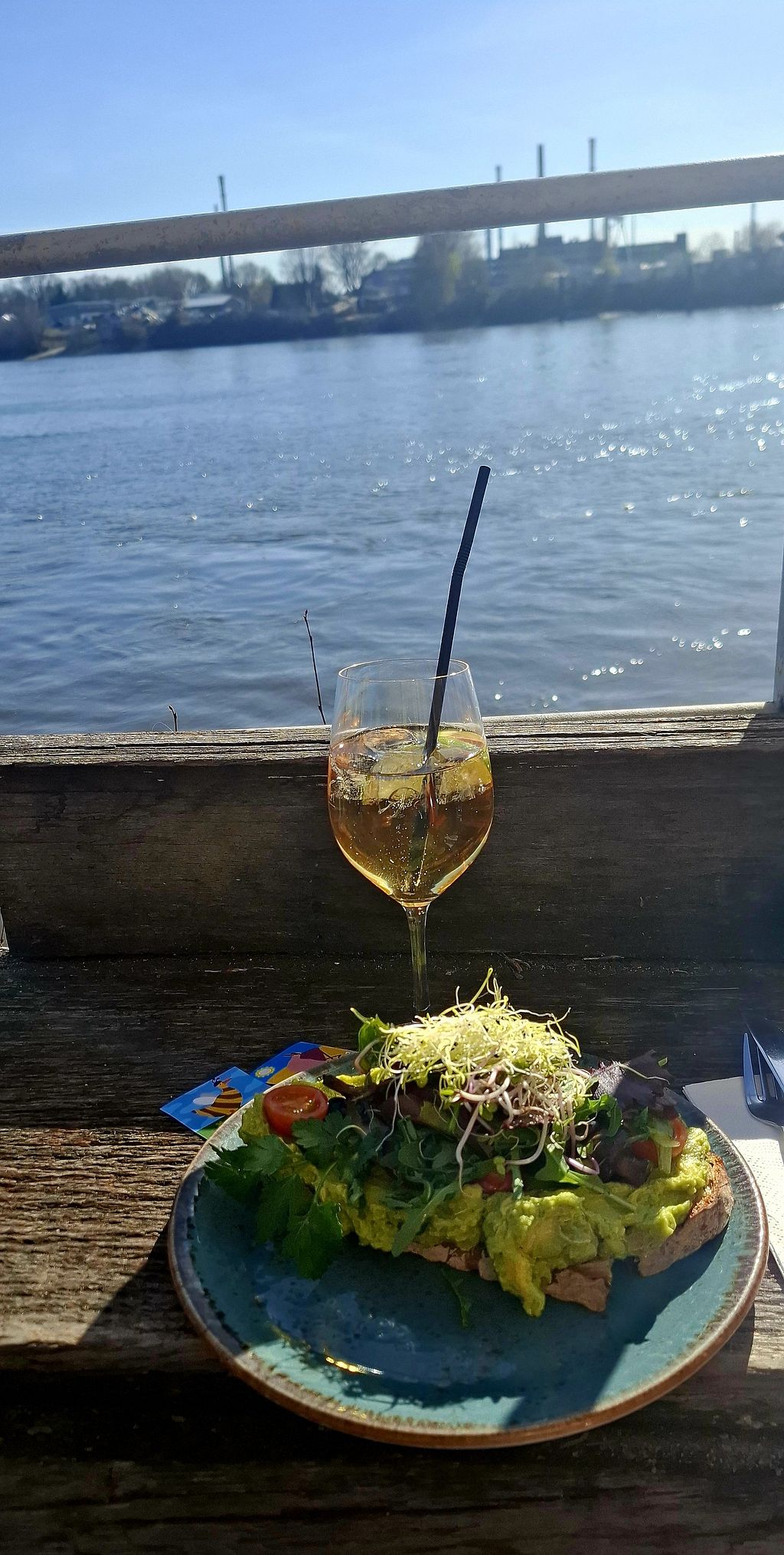 ... sondern auch am Freitagmittag gut besucht. Leckeres Avocadobrot, aber preislich mit 14,50€ schon obere Grenze. Man sitzt allerdings traumhaft dort und schöner als im Beachclub, auch wenn es nicht im Hamburger Hafen ist. ☀️♥️