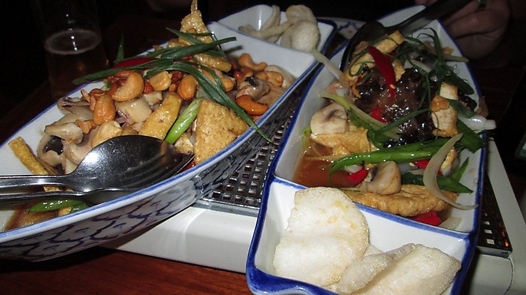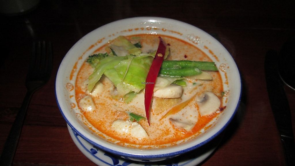 Serves meat, vegan options available. Thai restaurant with vegan choices. Menu includes tofu with mixed vegetables, yellow curry, red curry with mushrooms and tofu, tofu with cashews and more. Specify vegan when ordering. Open Mon-Sat 11:30-14:30, 17:00-21:30. Closed Sun.