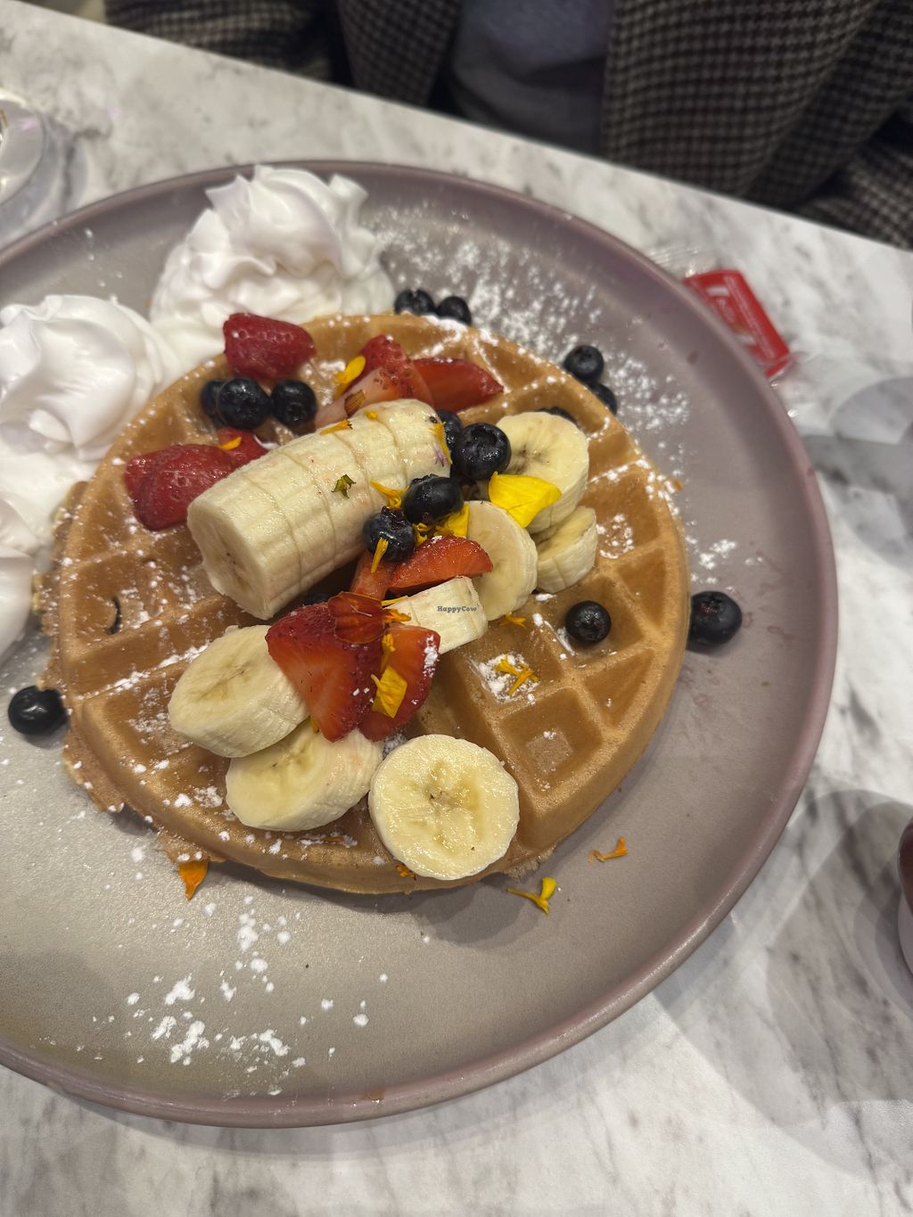 I was so hyped seeing the whole vegan menu with some really interesting stuff on it. But it's been a bit disappointing. I had the waffle with fruit and cream. Waffle was kinda dry, the maple syrup tastes cheap. I had a side of scrambled egg. I don't know what that was. It's swimming in fat, it's an amorphous blobb that tastes of nothing. No black salt on it or anything.