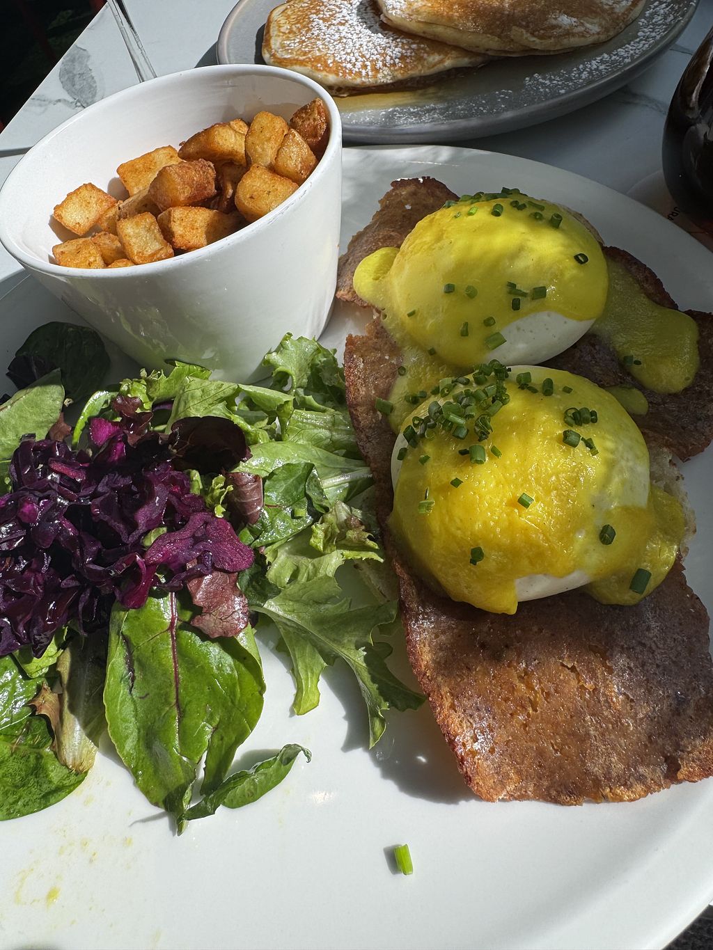 The eggz Benedict was fantastic! Loved that I could get the side of French toast! The “bacon” was Soo tasty! I loved it!