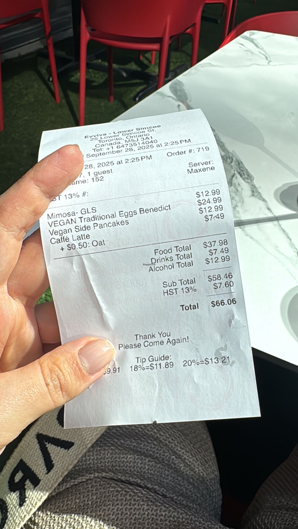 We struggle sometimes to find vegan breakfast so we were stoked to see so many options and its own vegan menu! Definitely on the pricey side, $25 for a meal, but that’s Toronto for ya. Service was great, incredible view of the CN tower on the patio. I donno how in the world they make their sunny side up “egg” but it’s a must try. Runny yoke and all! I got the Benny and my husband got the slam plate (traditional breaky). My only complaint was the egg whites were fairly bland but luckily on the benny with holandaise it helps mask it. We were both pleased and will be back!