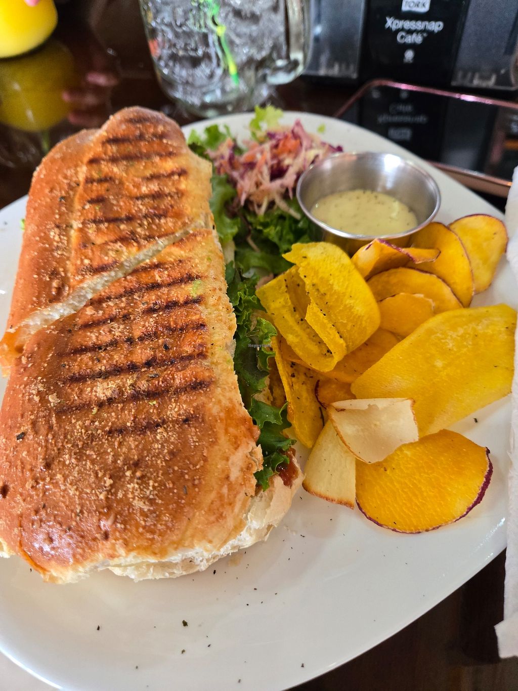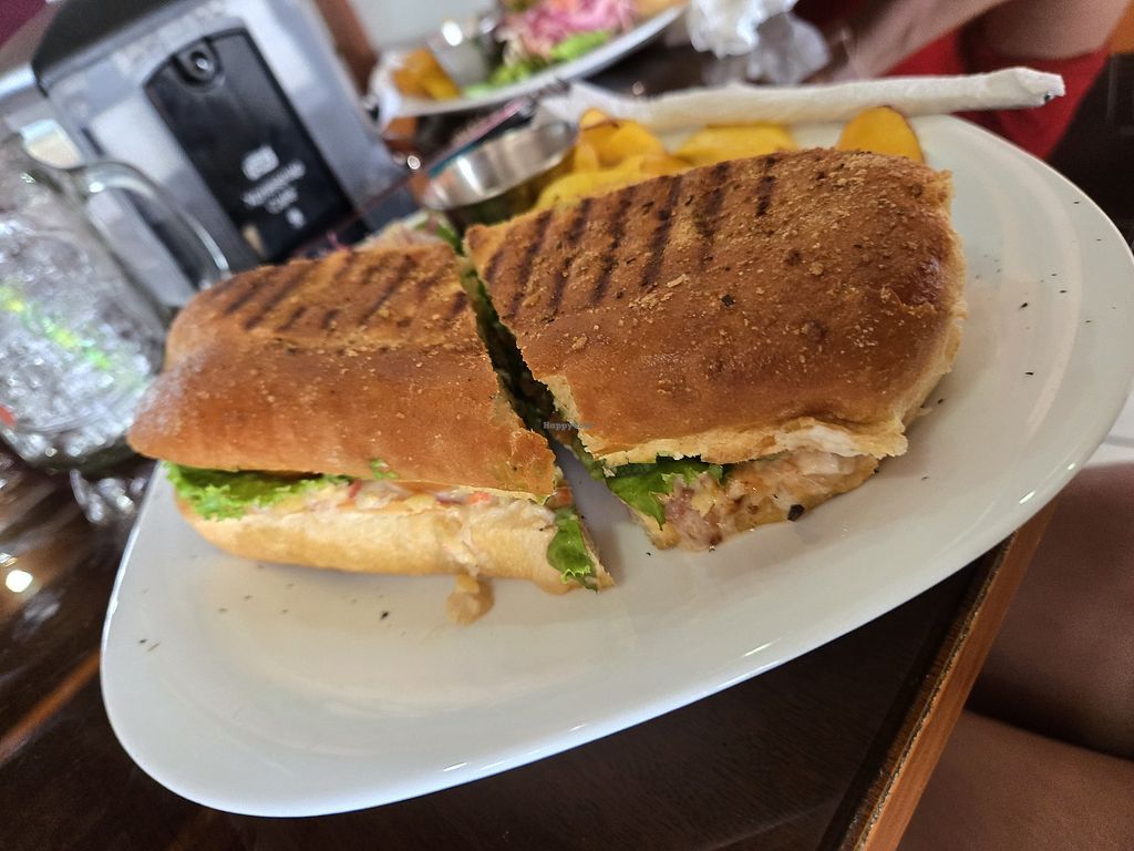 The vegan tuna panini is amazing, so flavourful and comes with a side of salad and chips with Ali olí.