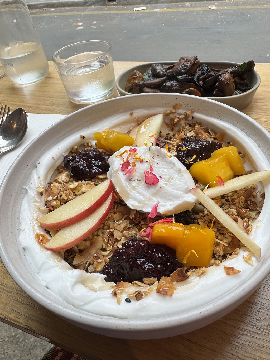 Quite a few vegan options and was really difficult to choose. Had the granola but really want to come back for the tofu bowl, vegan sandwich and overnight oats!!! Also got mushrooms on the side and they were so delicious. Must have had angel dust on them because did not need to add any salt or pepper to enhance the flavour. Partner ordered scrambled eggs with side of tomatoes and he was equally enamoured with the tomatoes!!