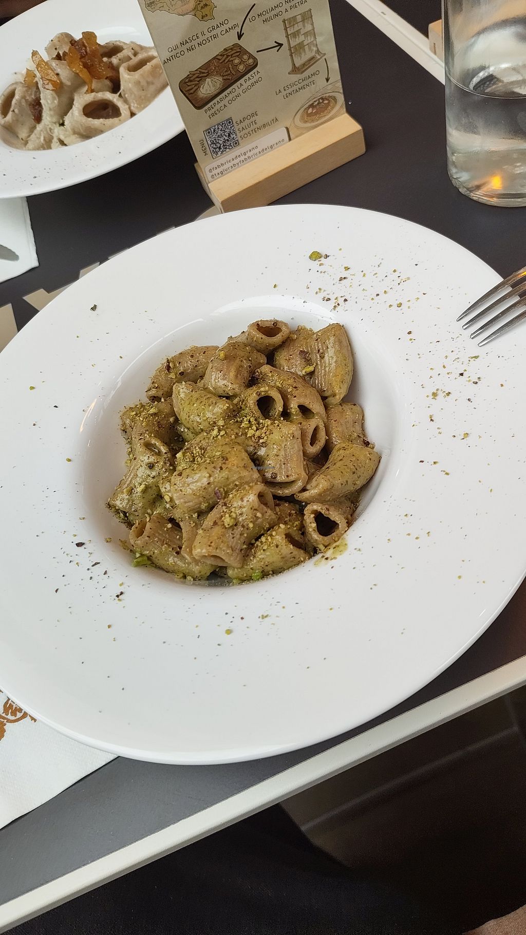 Una de las mejores pastas (vegan) que he probado en Italia. Pedí la ensalada pequeña con verdes y tomate cherry y la pasta con crema de pistachos. El personal sabía exactamente qué productos eran veganos de la carta, fueron muy amables y rápidos en la atención.