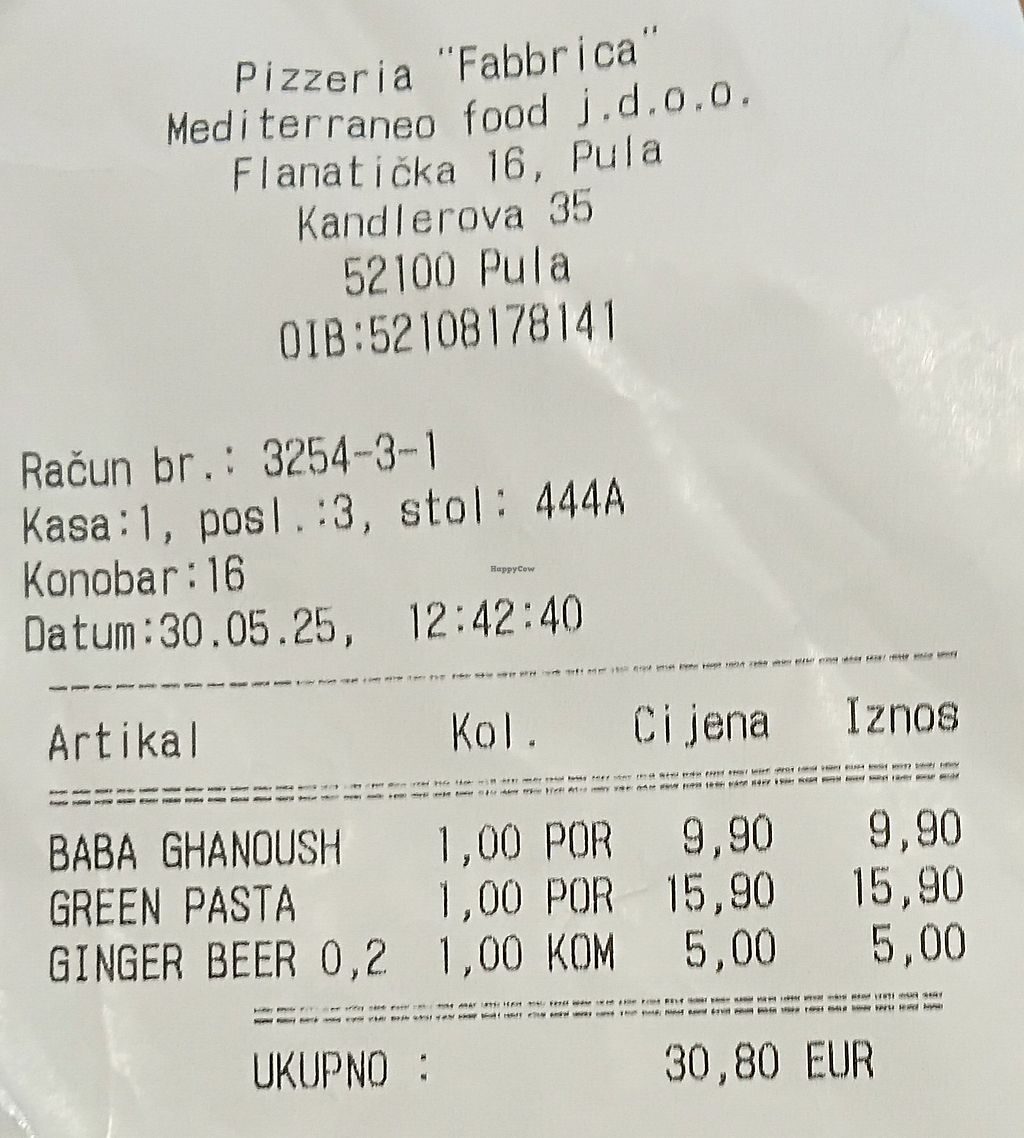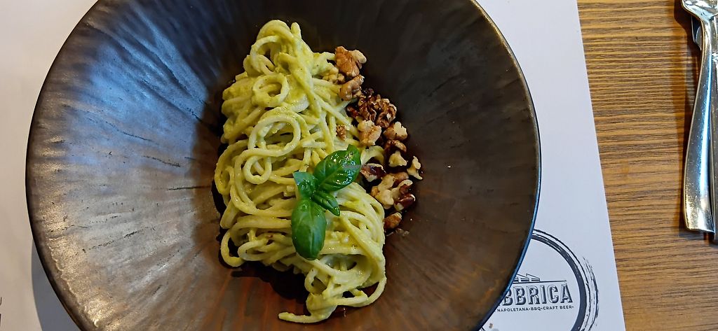 2nd time in Pula - same struggle to find good vegan food… Fabbrica is a nice place with Neapolitan pizza oven and a satisfying selection of craft beers. We ordered the green pasta (yummy avocado sauce but small size) and a pizza L‘Ortolona without cheese but extra olives and artichokes. The waiter commented „but without cheese its not very tasty!“… I added some basil leaves 🍃 from pots standing next to our table at the back terrace and enjoyed it a lot! Drank a Baltazar hoppy lager - very nice with the pizza - if you like the special taste of craft beer.